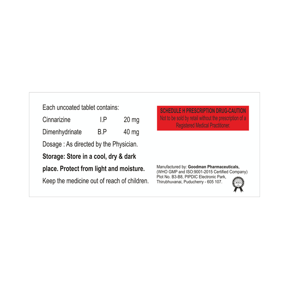 Salt Composition: Cinnarizine (20mg) + Dimenhydrinate (40mg)