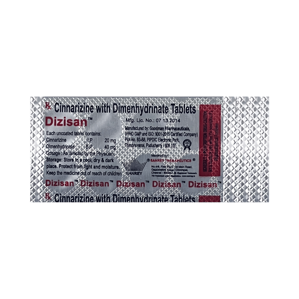 Dizisan Tablet is a combination of two medicines: Cinnarizine and Dimenhydrinate. Cinnarizine is a calcium channel antagonist which works by preventing constriction of the blood vessels of the inner ear. This improves the microcirculation of the ear. Dimenhydrinate is an antiallergic. It blocks the action of a chemical messenger (histamine) that is responsible for light-headedness in vertigo.