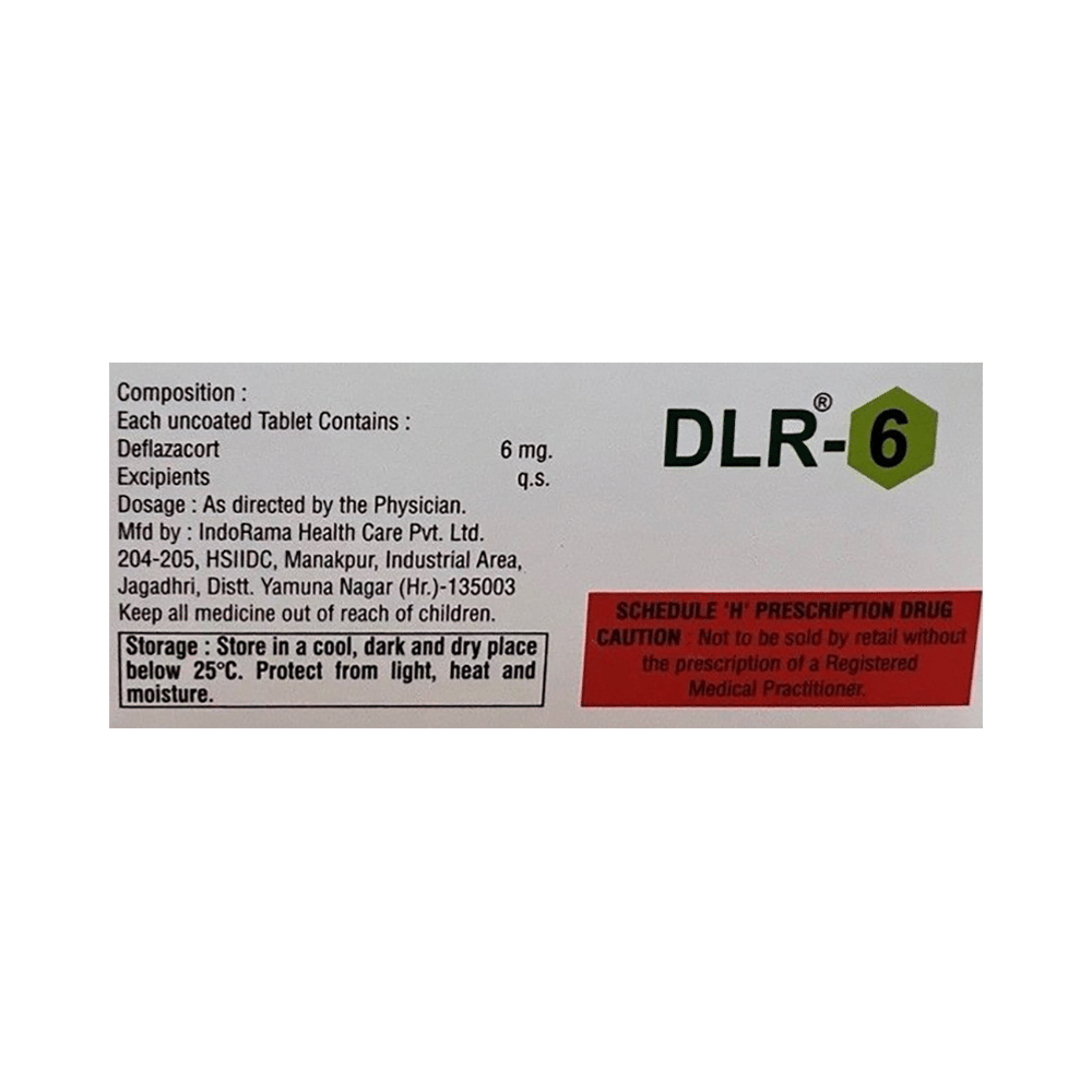 DLR 6 Tablet belongs to a group of medicines called steroids. It is used for the treatment of various diseases and conditions such as inflammatory conditions and autoimmune conditions. DLR 6 Tablet works by inhibiting the release of substances that cause swelling or by changing how the immune system works. It can be taken on an empty stomach or after food. Taking the medicine regularly at the right times increases its effectiveness. It is important to keep taking the medicine regularly until your doctor tells you it is safe to stop.Use of this medicine may cause some common side effects such as increased appetite, weight gain, frequent urge to urinate, Cushing syndrome, cough, upper respiratory tract infection, abnormal hair growth, obesity, and nasopharyngitis. If any of these side effects bother you, let your doctor know.DLR 6 Tablet can make it harder for you to fight off infections. Tell your doctor if you have any signs of infection such as a fever or sore throat. Before taking the medicine, you should let your doctor know of all the other medicines you are taking. Pregnant and breastfeeding women should consult their doctors before taking the medicine.