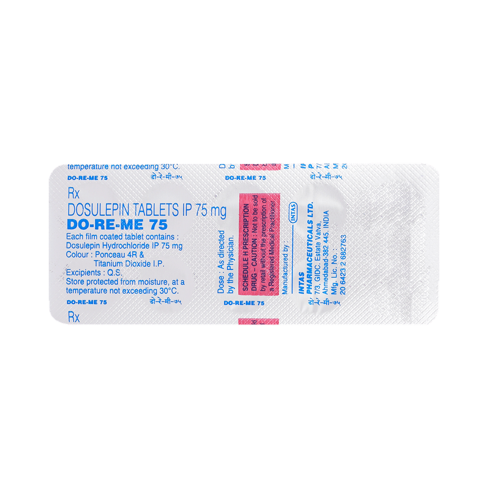 DO RE ME 75mg Tablet is a tricyclic antidepressant. It increases the levels of chemical messengers in the brain that help in regulating the mood and treat depression.