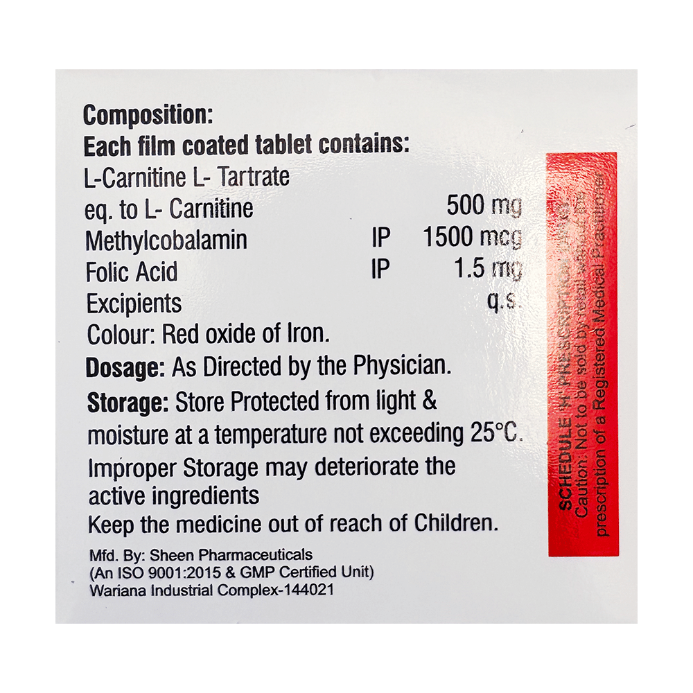 Salt Composition: Folic Acid (1.5mg) + L-Carnitine L-Tartrate (150mg) + Methylcobalamin (1500mcg)