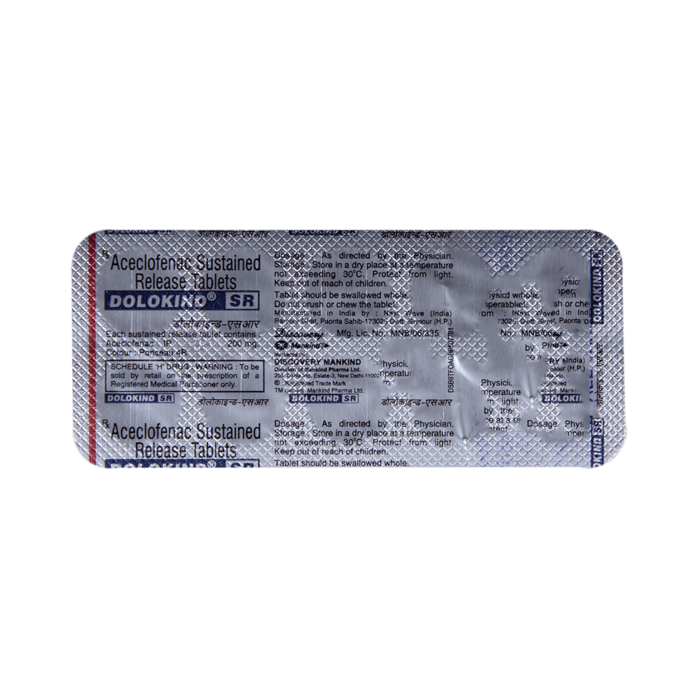 DOLOkind - SR Tablet is a pain-relieving medicine. It alleviates pain and inflammation in conditions such as rheumatoid arthritis, ankylosing spondylitis, osteoarthritis, low back pain, dental pain, gynecological pain, and painful & inflammatory conditions of the ear, nose, and throat. DOLOkind - SR Tablet should be taken at the dose and duration advised by your doctor. It should be taken with food or milk to prevent stomach upset. Taking the medicine regularly at the right times increases its effectiveness. It is important to continue taking it until your doctor tells you it is safe to stop.Vomiting, stomach pain, nausea, and indigestion are some of the common side effects of this medicine. It may also cause dizziness, drowsiness, or visual disturbances. If you take this medicine for long-term treatment, your doctor may regularly monitor your kidney function, liver function, and blood component levels. Long-term use may lead to serious complications, such as stomach bleeding and kidney problems. DOLOkind - SR Tablet is not recommended if you are pregnant or breastfeeding.
