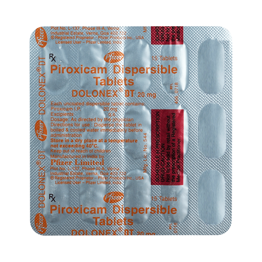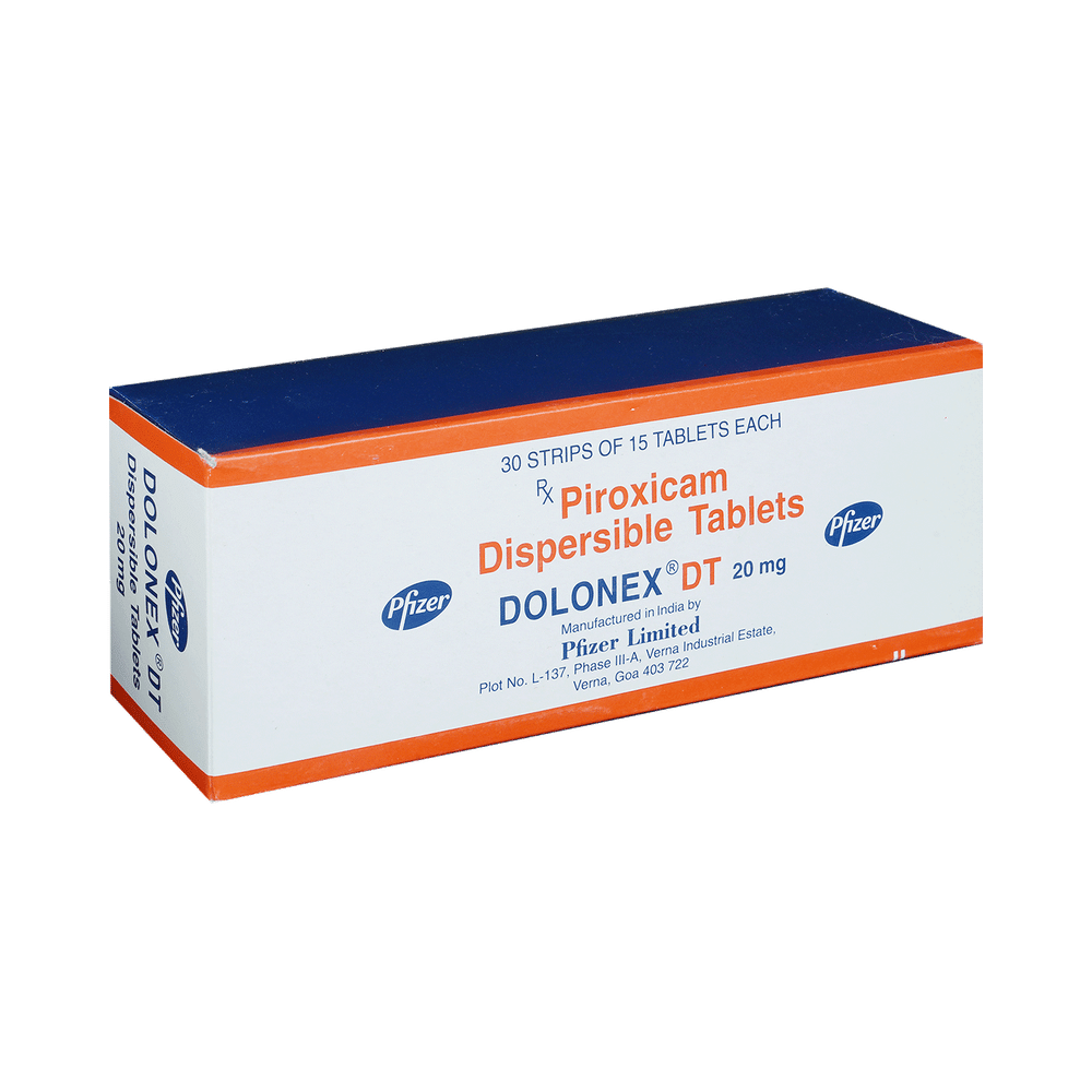 Dolonex DT 20mg Tablet is a pain-relieving medicine. It is used to treat moderate to severe pain in conditions such as osteoarthritis and rheumatoid arthritis. It helps relieve pain and swelling in the joints and muscles. Dolonex DT 20mg Tablet should be taken with food. This will prevent you from getting an upset stomach. The dose and duration will depend on what you are taking it for and how well it helps your symptoms. You should keep taking the medicine even if you feel better until the doctor says it is alright to stop using it.The most common side effects of this medicine include mild vomiting, stomach pain, nausea, headache, and dizziness. If any of these side effects persist or get worse, you should let your doctor know. Your doctor may be able to suggest ways of preventing or reducing the symptoms.Before using it, you should let your doctor know if you have a history of stomach ulcers, heart diseases, high blood pressure, and liver or kidney disease. Let your doctor also know about all the other medicines you are taking because they may affect, or be affected by, this medicine. Pregnant and breastfeeding mothers should consult their doctors before using the medicine.