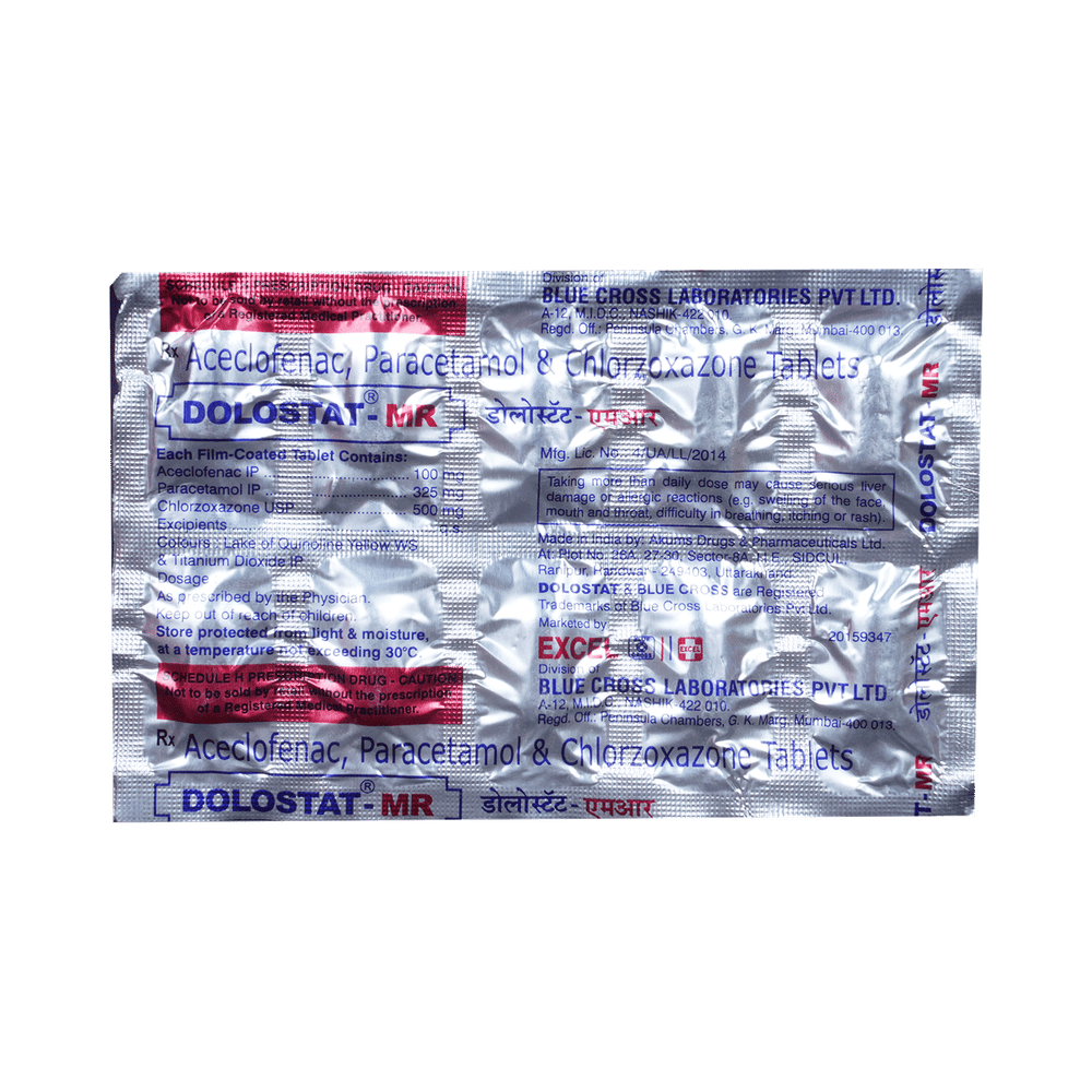 Dolostat MR 100 mg/325 mg/500 mg Tablet is a combination medicine that helps in relieving muscular pain. It works by blocking the release of certain chemical messengers that cause pain, inflammation, and fever. This improves the movement of muscles and provides relief from pain and discomfort. Dolostat MR 100 mg/325 mg/500 mg Tablet can be taken with or without food. The dose and duration will depend on the severity of your condition. You should keep taking the medicine even if you feel better until the doctor says it is alright to stop using it.Using this medicine may cause common side effects such as nausea, vomiting, heartburn, stomach pain, diarrhea, and loss of appetite. If these persist or get worse, let your doctor know. In general, you should try to use the smallest amount necessary to control your symptoms.Before using the medicine, you should tell your doctor if you have any other medical conditions or disorders. To make sure it is safe, you should let your doctor know all the other medicines you are taking. Also, tell your doctor if you have any problems with the liver or kidneys. You should avoid the consumption of alcohol while on treatment with this medicine. Pregnant and breastfeeding women should consult their doctors first before using the medicine.
