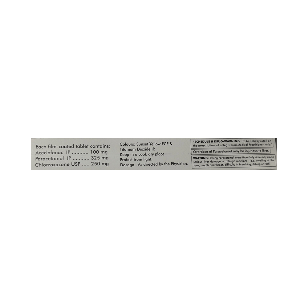 Salt Composition: Aceclofenac (100mg) + Paracetamol (325mg) + Chlorzoxazone (250mg)