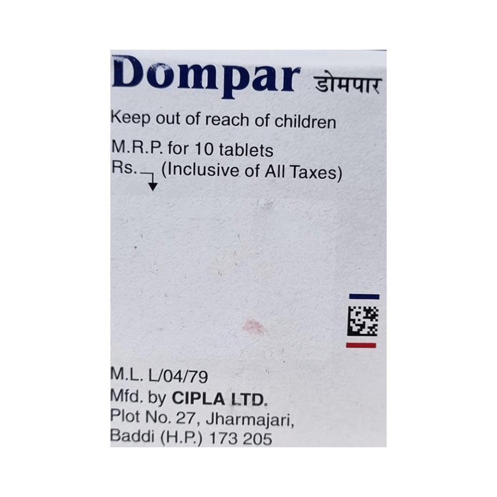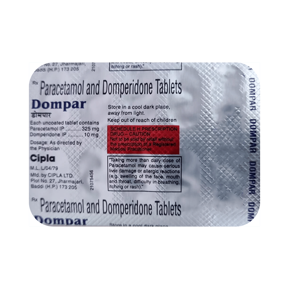 Dompar 10mg/325mg Tablet is a prescription medicine used in the treatment of migraine. It prevents pain signals to reach the brain to reduce pain. It also blocks certain substances in the brain that trigger nausea or vomiting during migraine headaches. Dompar 10mg/325mg Tablet is taken without food in a dose and duration as advised by the doctor. The dose you are given will depend on your condition and how you respond to the medicine. You should keep taking this medicine for as long as your doctor recommends. If you stop treatment too early your symptoms may come back and your condition may worsen. Let your healthcare team know about all other medications you are taking as some may affect, or be affected by this medicine.The most common side effect is dryness in mouth. This is temporary and usually resolve with time. Contact your doctor straight away if you are at all concerned about these side effects. Migraine attacks can be managed by identifying migraine-causing triggers which may be red wine, caffeine withdrawal, stress, and skipped meals, etc. You can identify personal triggers by maintaining a diary of what you are doing, what you are eating, and any stressful activity happened before migraine attack.Before taking this medicine, you should tell your doctor if you are pregnant, planning pregnancy or breastfeeding. You should tell your doctor if you have any kidney or liver diseases so that your doctor can prescribe a suitable dose for you.