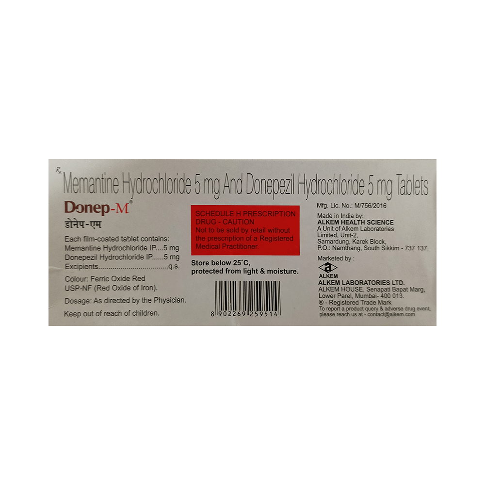 Donep-M Tablet is a prescription medicine used to treat Alzheimer's disease. It helps to slow down the progression of moderate to severe Alzheimer's by improving memory and thinking. It also increases the levels of a chemical messenger involved in the transmission of nerve signals. Donep-M Tablet can be taken with or without food, but you may take it with food to avoid a stomach upset. However, it is advised to take it at the same time each day to maintain a consistent level of medicine in the blood. Do not skip any doses, but if you miss a dose of this medicine, take it as soon as you remember. Finish the full course of treatment even if you feel better and do not stop taking it suddenly.Some common side effects of this medicine include nausea, vomiting, loss of appetite, fatigue, and headache. It may also cause dizziness and sleepiness. So, do not drive or do anything that requires mental focus until you know how this medicine affects you. Drink plenty of fluids to keep yourself hydrated while taking this medicine as this medicine may cause diarrhea.Before using this medicine, you should tell your doctor if you have ever had heart problems, stomach ulcers, epilepsy or asthma. It may also affect, or be affected by, some other drugs you are using so let your doctor know what these are to be safe. Inform your doctor if you are pregnant, planning pregnancy or breastfeeding.