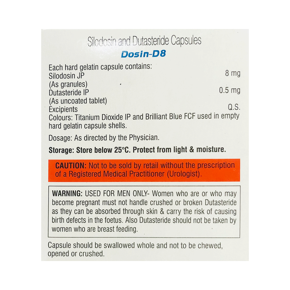 Dosin-D 8 Capsule is a combination of two medicines that work in different ways to treat men with an enlarged prostate gland. It helps to relieve symptoms such as difficulty urinating or needing to go to the toilet more often. It is not used to prevent prostate cancer. Dosin-D 8 Capsule should be taken at the same time each day. Take it as a whole, do not break, chew, or crush them. Your doctor will prescribe the dose most suitable for you. To gain the most benefit and treat your symptoms effectively you should not miss doses, even if you feel well. It may take up to 4 weeks to notice an improvement in symptoms but keep taking them regularly. Tell your doctor if your symptoms do not improve after 4 weeks or if they get worse.The most common side effects of this medicine include decreased libido, inability to get an erection (impotence), breast tenderness, and enlargement of your breasts. If these effects worry you or do not go away, call your doctor for advice. You may also feel dizzy or drowsy. These risks are higher when you first start taking this drug. Remember, your doctor has given you this medicine because the benefits are greater than the risks of the side effects.This medicine should not be taken by women or children. Before taking it, tell your doctor if you have low blood pressure or liver or kidney disease. This medicine may not be suitable. It can also affect, or be affected by, other drugs so let your doctor know all other medicines you are taking. You may be advised to wear a condom during sex and to have your blood pressure checked frequently. Talk to your healthcare team if you drink alcohol.