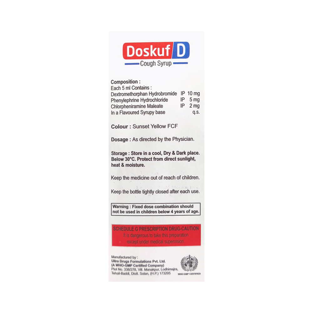 Doskuf D Syrup Orange is a medicine used in the treatment of common cold and cough. It can provide quick relief from cough and common cold symptoms like runny nose, stuffy nose, sneezing, watery eyes, and congestion or stuffiness. Doskuf D Syrup Orange is taken with or without food in a dose and duration as advised by the doctor. The dose you are given will depend on your condition and how you respond to the medicine. You should keep taking this medicine for as long as your doctor recommends. If you stop treatment too early your symptoms may come back and your condition may worsen. Let your healthcare team know about all other medications you are taking as some may affect, or be affected by this medicine.Common side effects of this medicine include headache, sedation, double vision, vomiting, diarrhea, dry mouth, and nausea. Most of these are temporary and usually resolve with time. Contact your doctor straight away if you are at all concerned about any of these side effects. This medicine can also cause sleepiness, so do not drive or do anything that requires mental focus until you know how this medicine affects you. Avoid drinking alcohol while taking this medicine as it can worsen your sleepiness.Never support self-medication or recommend your medicine to another person. It is beneficial to have plenty of fluids while taking this medication. Before taking this medicine, you should tell your doctor if you are pregnant, planning pregnancy or breastfeeding. You should also tell your doctor if you have any kidney or liver diseases so that your doctor can prescribe a suitable dose for you.