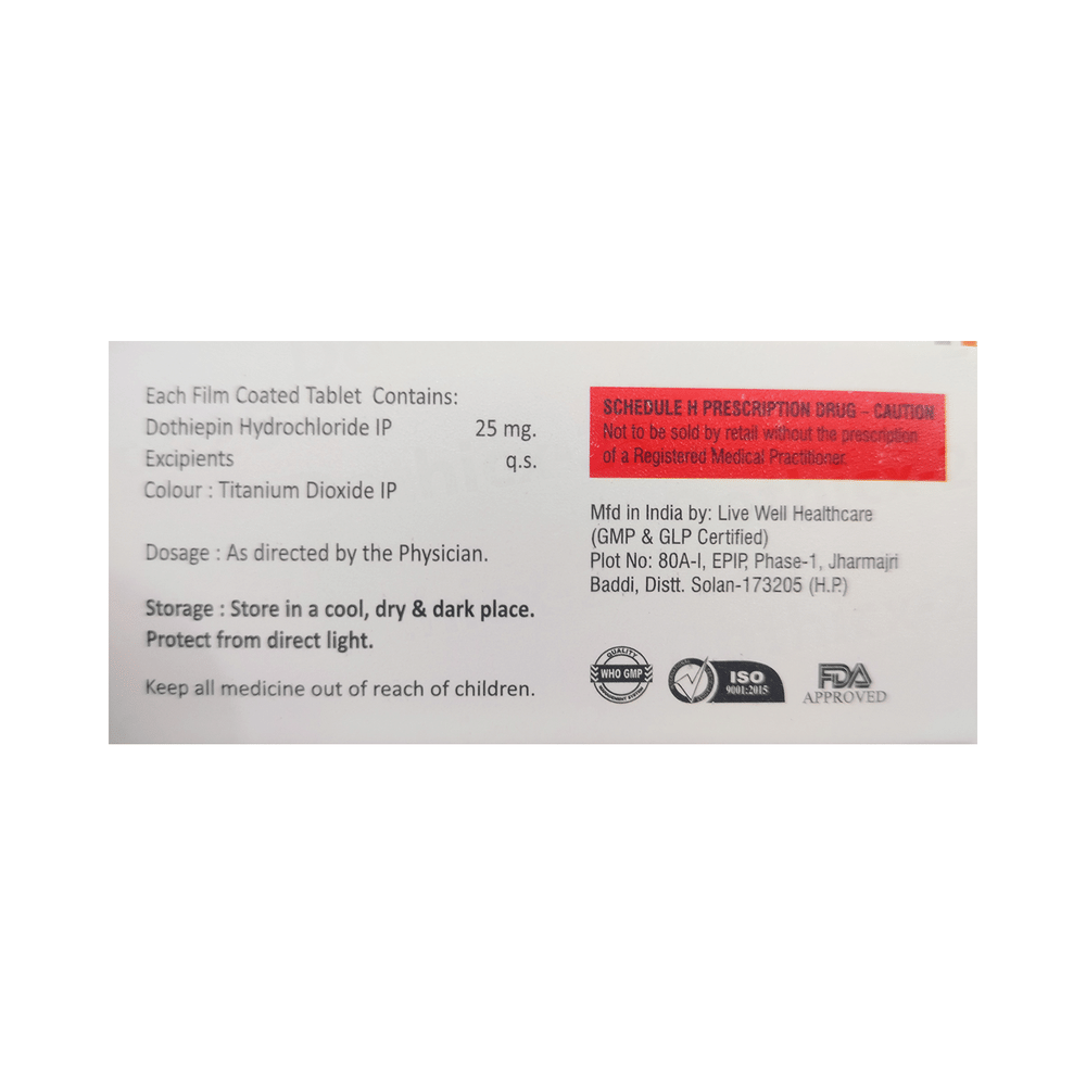 Dothicx 25 Tablet is a medicine used to treat depression and anxiety. It helps improve mood, reduce feelings of sadness or worry, and restore interest in daily activities. It works by increasing the levels of certain natural chemicals in the brain, which help improve mood and relieve anxiety. Dothicx 25 Tablet should be taken exactly as prescribed by your doctor. It may be taken with or without food. Take it regularly and take it at the same time every day. Do not stop taking the medicine suddenly without your doctor's advice, as this can cause withdrawal symptoms or worsen your condition. Along with taking the medicine, follow a healthy lifestyle, get enough sleep, and attend regular follow-up appointments.Some common side effects of Dothicx 25 Tablet include dry mouth, drowsiness, dizziness, constipation, and weight gain. These usually get better as your body adjusts to the medicine. Drinking plenty of water, eating a high-fibre diet, and avoiding alcohol may help reduce these side effects. If you feel extremely sleepy or dizzy, avoid driving or operating machinery. If any side effects become bothersome or do not go away, let your doctor know.Before taking Dothicx 25 Tablet, inform your doctor if you have any heart, liver, or kidney problems, or a history of seizures or glaucoma. This medicine may not be suitable for people with certain medical conditions. Avoid drinking alcohol while taking Dothicx 25 Tablet, as it can increase drowsiness and worsen side effects. Let your doctor know about all the medicines you are taking, as some medicines may interact with Dothicx 25 Tablet. Pregnant or breastfeeding women should consult their doctor before using this medicine.