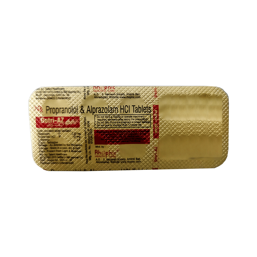Dotri-AZ Tablet is a combination of two medicines: Alprazolam and Propranolol. Alprazolam is a benzodiazepine. It works by increasing the action of GABA, a chemical messenger which suppresses the abnormal and excessive activity of the nerve cells in brain. Propranolol is a beta blocker which blocks the action of certain chemical messengers on the heart and blood vessels. This reduces heart rate, blood pressure, and strain on the heart.