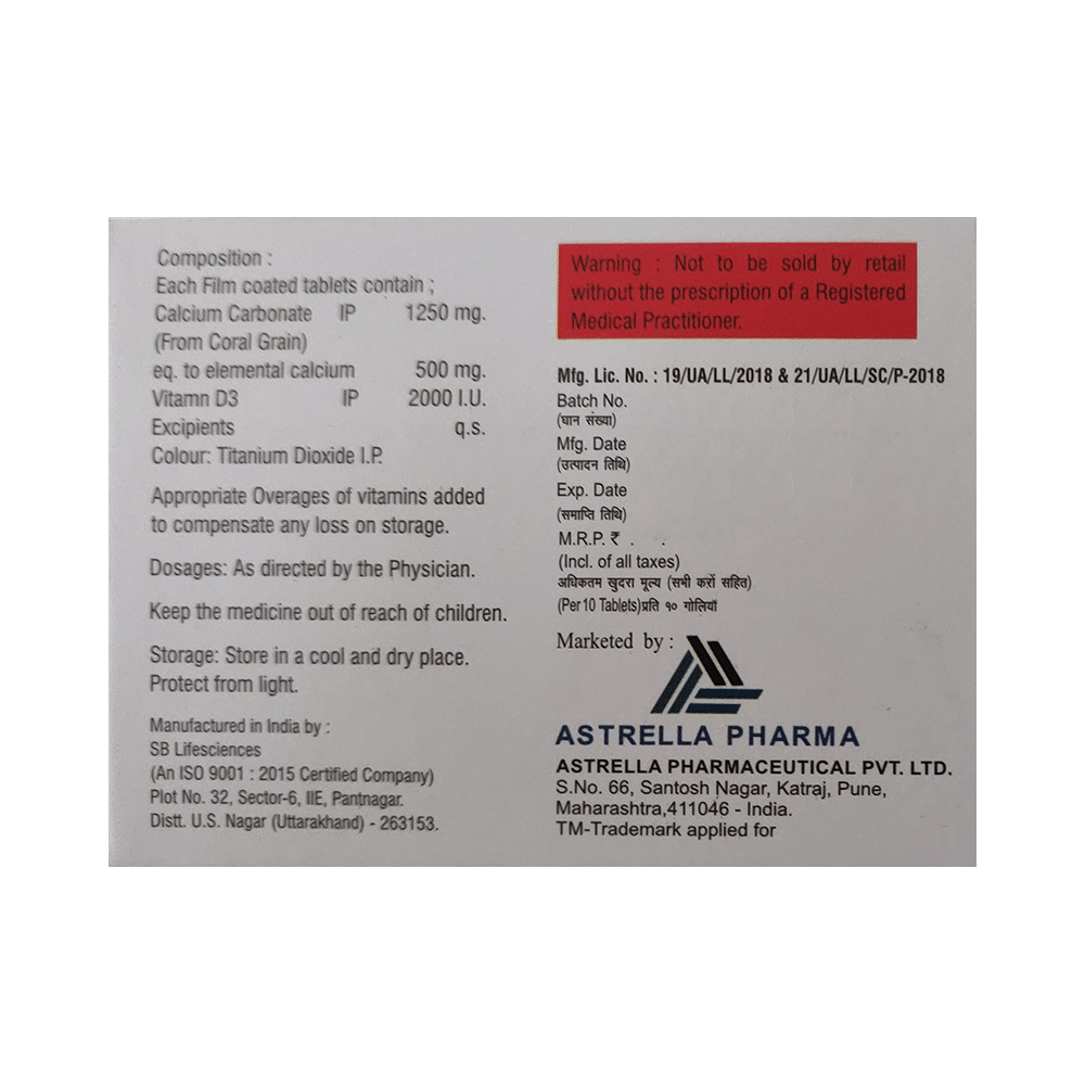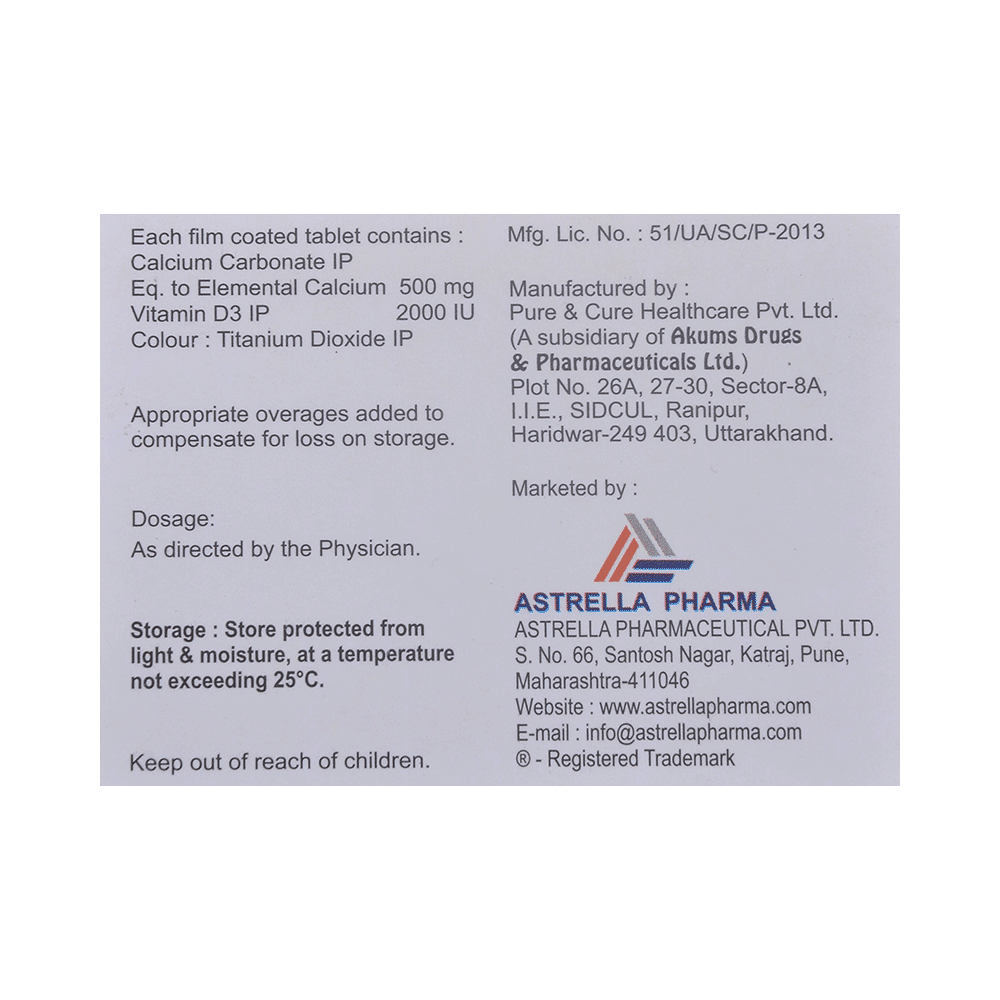 Salt Composition: Calcium (500mg) + Vitamin D3 (2000IU)