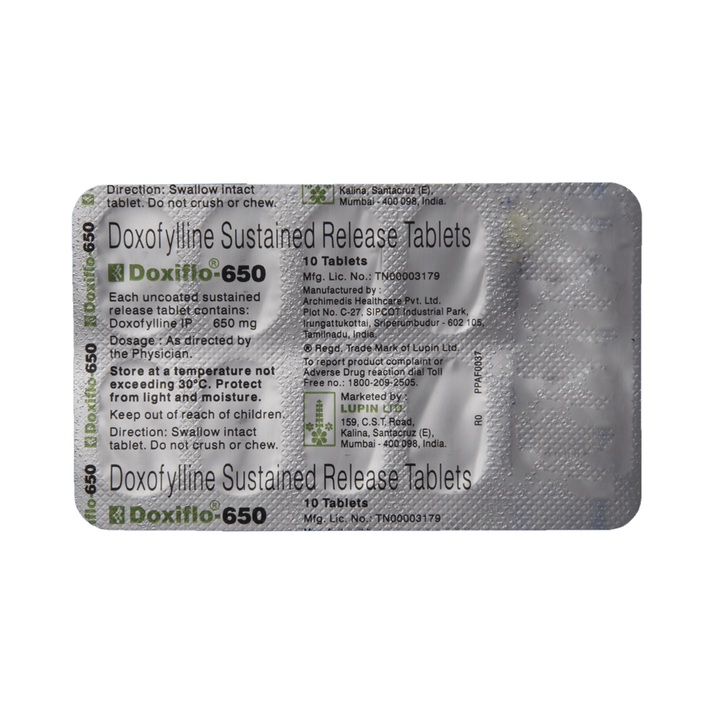 In AsthmaDoxiflo 650 Tablet SR is used in asthma to improve breathing by helping open the airways. It can ease chest tightness, wheezing, and shortness of breath, allowing people to carry on with daily routines more comfortably.In Chronic obstructive pulmonary disease (COPD)In COPD, Doxiflo 650 Tablet SR supports lung function by reducing airway resistance and inflammation. It helps decrease coughing and breathlessness, especially during physical activity, and contributes to fewer flare-ups over time.show moreshow less