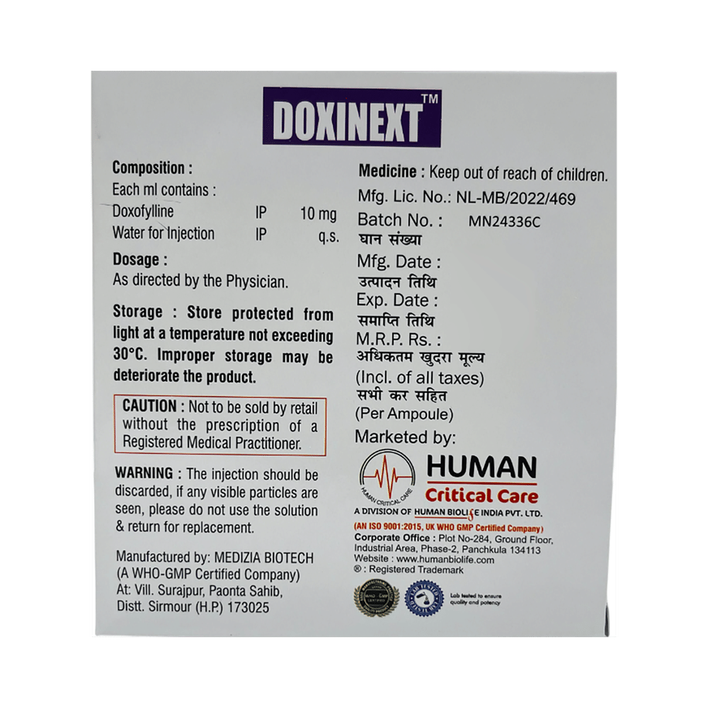 Doxinext Injection is used to treat and prevent symptoms of asthma and chronic obstructive pulmonary disorder (a lung disorder in which the flow of air to the lung is blocked). It helps in relaxing the muscles of the air passages, thus widening it and making it easier to breathe. Doxinext Injection is given as an injection by the doctor. The dose and duration of your treatment will depend on what you are being treated for and the severity of your condition. Get the injection for as long as it is prescribed to you. Do not miss any doses, in case you missed a dose, get it as soon as you remember it. Your doctor may get regular blood tests to check for medicine levels in the blood. The most common side effects of this medicine include vomiting, headache, nausea, and stomach upset. If these bother you or appear serious, let your doctor know. There may be ways of reducing or preventing them. Generally, it is advised not to consume alcohol or do not smoke while on treatment. You must avoid high caffeinated products like coffee, tea, and dark chocolates as it enhances drug side effects.Before taking this medicine, let your doctor if you have kidney or liver disease or if you have heart-related problems. Your doctor should also know about all other medicines you are taking as many of these may make this medicine less effective or change the way it works. Inform your doctor if you are pregnant or breastfeeding before starting the treatment.