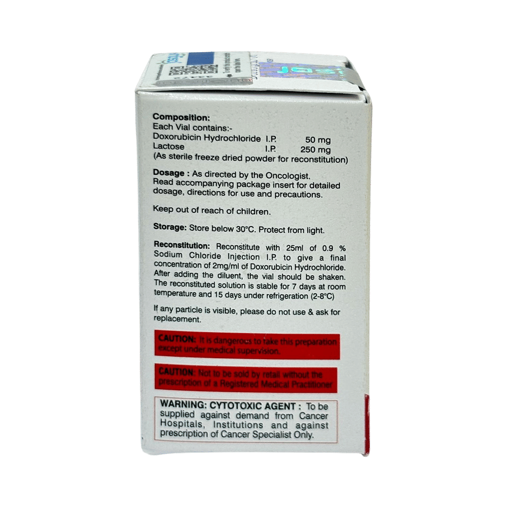 Doxojas 50 Injection is used in the treatment of some kinds of cancer. It is also used in the treatment of breast cancer, where there is an increased cardiac risk. It can be used on its own, or sometimes given together with certain other medicines as part of combination chemotherapy. Doxojas 50 Injection can be used in both adults and children. It is given as injection into vein with extreme caution by a qualified medical professional. Your doctor will decide what dose is necessary and how often you need to take it. This will depend on what you are being treated for and may change from time to time. You should take it exactly as your doctor has advised. Taking it in the wrong way or taking too much can cause very serious side effects. It may take several weeks or months for you to see or feel the benefits but do not stop taking it unless your doctor tells you to. It makes contraceptive pills less effective, so it advised to use reliable contraception during and after 6 months of the treatment.The most common side effects of this medicine include nausea, vomiting, rash, weakness, low blood platelets. If they do not go away or get worse, tell your doctor. There may be ways of preventing or reducing these effects. It is very strong medicine and some people may develop serious side effects while taking it. This medicine may lead to problems with your blood, liver or heart. Your doctor will advise you regular blood tests to check for these.Before taking this medicine, let your doctor know if you have liver disease. Your doctor should also know about all other medicines you are taking as many of these may make this medicine less effective or change the way it works. Tell your doctor if you are pregnant or breastfeeding.