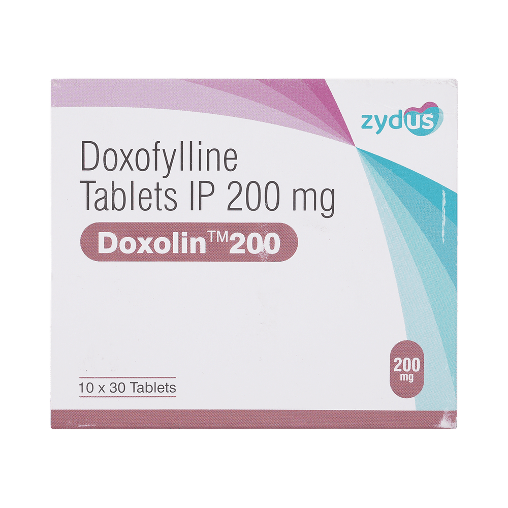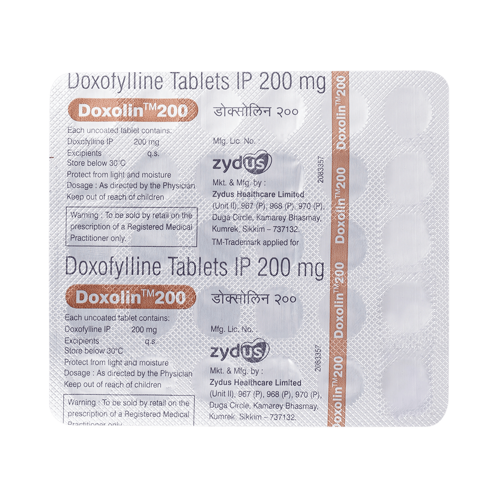 Doxolin 200mg Tablet is used to treat and prevent symptoms of asthma and chronic obstructive pulmonary disorder (a lung disorder in which flow of air to the lung is blocked). It helps in relaxing the muscles of the air passages, thus widening it and making it easier to breathe. Doxolin 200mg Tablet can be taken with the food in the evening. Take it in the exact dose and duration as prescribed by your doctor. The dose and how often should take it may depend on what you are taking it for. Take it for as long as it is prescribed for you. In case you missed a dose, take it as soon as you remember it. It does not work immediately or prevent the already started breathing trouble, hence always carry your medical inhaler with you for an emergency.The most common side effects of this medicine include vomiting, headache, nausea, and stomach upset. If these bother you or appear serious, let your doctor know. There may be ways of reducing or preventing them. Generally, it is advised not to consume alcohol or do not smoke while on treatment. You must avoid high caffeinated products like coffee, tea, and dark chocolates as it enhances drug side effects.Before taking this medicine, let your doctor if you have kidney or liver disease or if you have heart-related problems. Your doctor should also know about all other medicines you are taking as many of these may make this medicine less effective or change the way it works. Inform your doctor if you are pregnant or breastfeeding before starting the treatment.