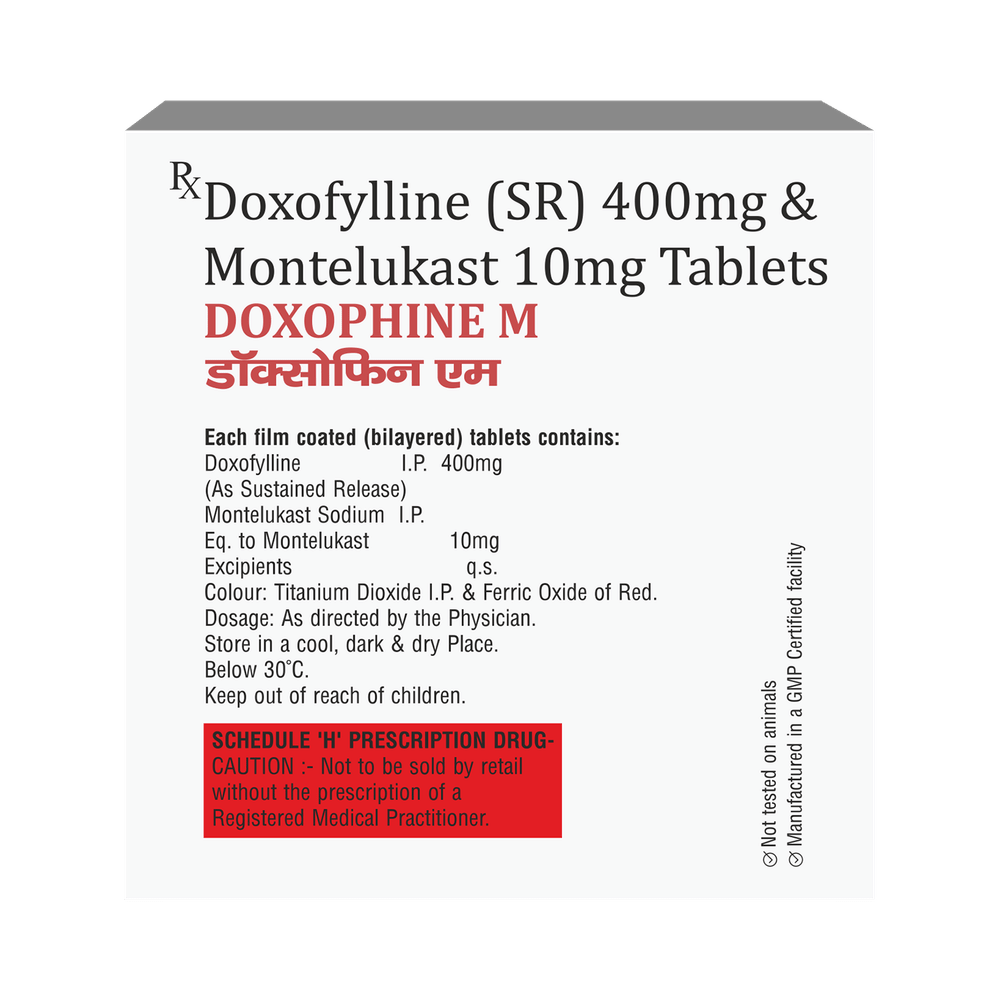 Doxophine M Tablet SR is a combination of two drugs. Doxofylline is a bronchodilator. It works by relaxing and widening the muscles in the airways. Montelukast is a leukotriene antagonist that blocks the action of leukotriene, a chemical messenger. This reduces inflammation (swelling) in the airways to prevent asthma and relieve symptoms of allergies.