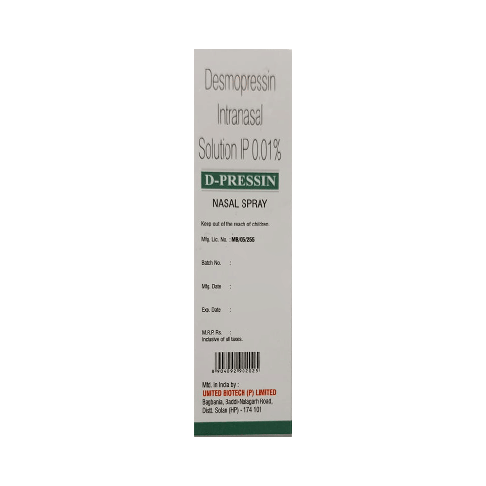 Dpressin Nasal Spray is used in the treatment of diabetes insipidus and bed-wetting. This medicine helps decrease the urge to urinate and help resume more normal life-style. It is generally used in patients who cannot take the oral form of medicine. Dpressin Nasal Spray should be used as you have been advised by your doctor. Normally you should blow your nose gently before using it, keep one nostril closed while applying the medicine into the other and then sniff hard to make sure it reaches deep into the nose. Then repeat for the other nostril.The most common side effects of this medicine include nasal discomfort, nasopharyngitis, nasal congestion, sneezing, headache, nausea, and cough. These are usually mild but if they bother you or do not go away, your doctor may be able to suggest ways of preventing or reducing them.It is generally a safe medicine but, before taking it, talk to your doctor about any health problems you have such as heart problems or high blood pressure (hypertension) or overactive thyroid gland or glaucoma or prostate enlargement. Let your doctor know about any other medicines you are taking to make sure you are safe. Ask your doctor for advice before using this medicine if you are pregnant or breastfeeding.