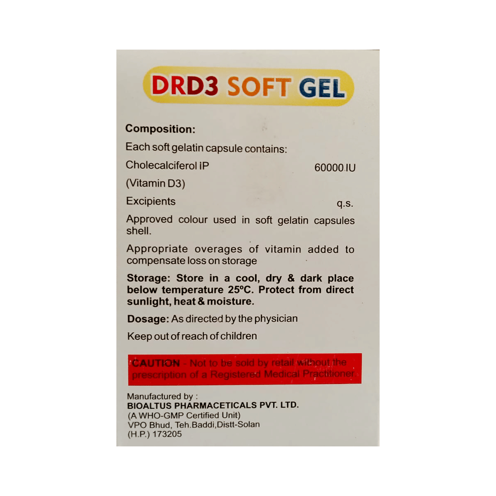 DRD3 Soft Gel is used in the treatment of vitamin D deficiency and osteoporosis. It helps the body to absorb calcium. Calcium is essential for maintaining strong and healthy bones. It is used when your diet does not provide enough calcium. DRD3 Soft Gel should be taken as directed by your doctor. It is best taken with or after food, as this helps your body absorb it, and you should take it regularly to get the most benefits. If you are using it to treat osteoporosis, you will also be prescribed other medicines. This medicine may be only part of a complete treatment program that includes making changes to your diet and taking calcium and vitamin supplements. Learn about the foods you should eat to ensure you get enough calcium and vitamin D.DRD3 Soft Gel has few side effects, and none are common. If you take too much, you may feel weakness, muscle pain, or a metallic taste in your mouth. If you experience any such side effects, speak with your doctor. They may be able to help you reduce or treat the symptoms.Before taking this medicine, tell your doctor if you have high calcium levels in your blood or if you have any heart, kidney, or liver disease. Some other medicines can decrease the absorption of vitamin D3, so let your doctor know about all the other medicines you are taking to make sure you are safe. This medicine may help during pregnancy when your body needs more vitamin D, but too much could harm your baby. Discuss it with your doctor.