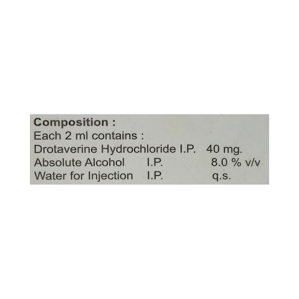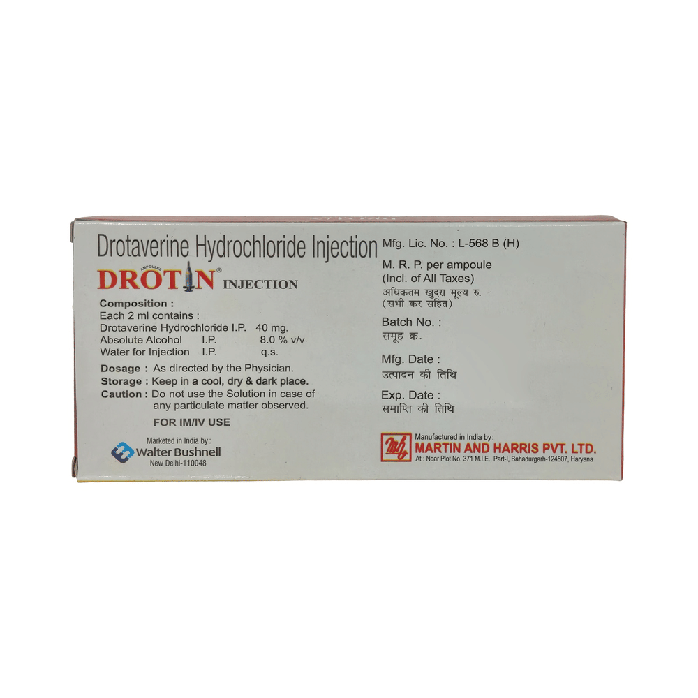Drotin 40mg Injection is an antispasmodic medicine. It is used in the treatment of menstrual pain and abdominal pain. It provides relief from pain due to smooth muscle spasm like menstrual pain, pain due to kidney stones, pain due to biliary stone and gastrointestinal colicky pain. Drotin 40mg Injection is given as an injection under the medical supervision of a doctor. The dose and how often you take it depends on what you are taking it for. Your doctor will decide how much you need to improve your symptoms. You should take this medicine for as long as it is prescribed for you.The most common side effects of this medicine include nausea, vomiting, and dryness in the mouth. If these bother you or appear serious, let your doctor know. There may be ways of reducing or preventing them. It may also make you feel dizzy as of low blood pressure if happens take caution while driving.Before taking this medicine, tell your doctor if you have ever had severe heart disease or have blood pressure issues, or you have liver or kidney disease. Your doctor should also know about all other medicines you are taking as many of these may make this medicine less effective or change the way it works. Your doctor may check blood pressure regularly while on treatment with this medicine.