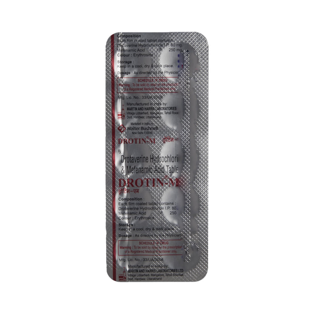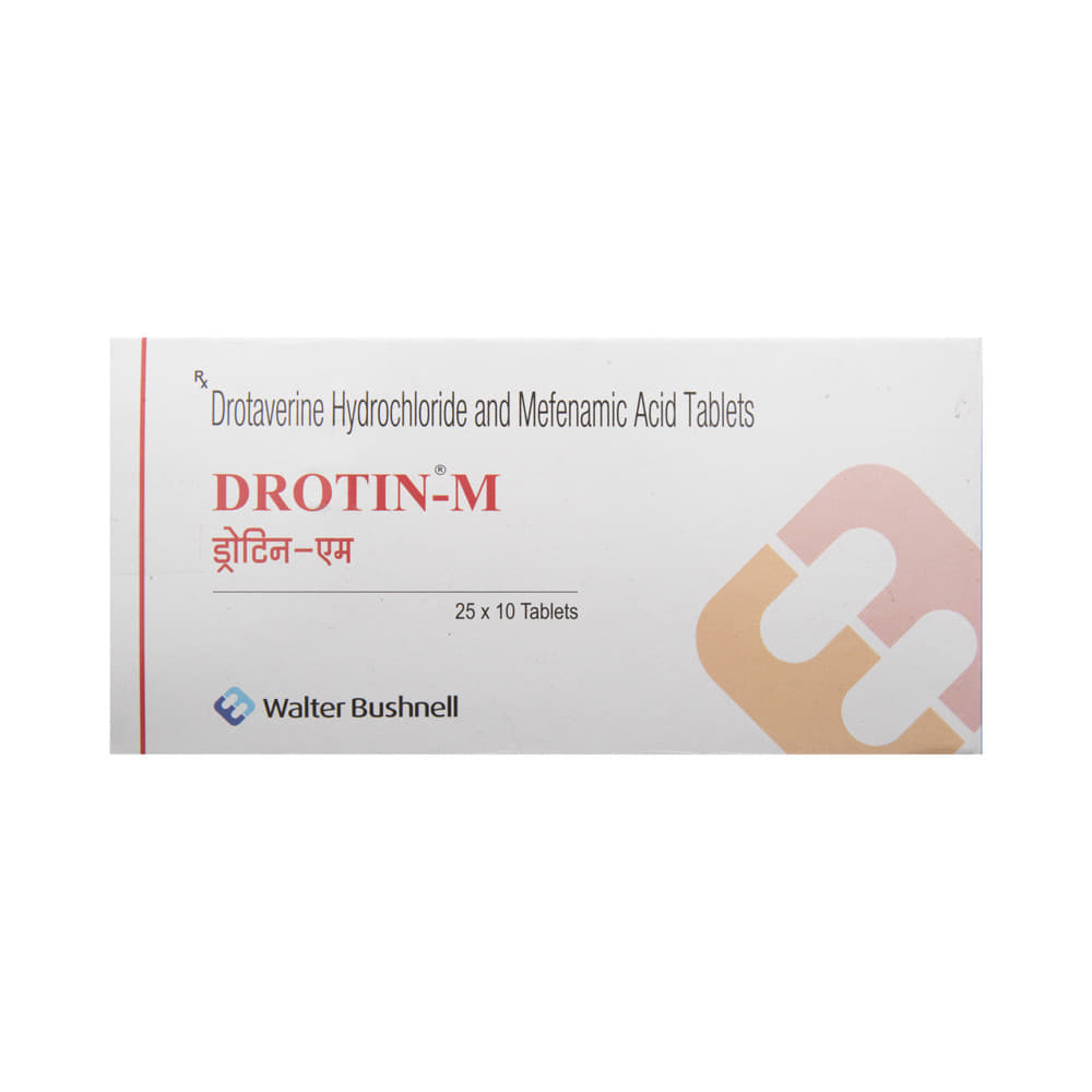 Drotin-M Tablet is a combination of two medicines: Drotaverine and Mefenamic Acid, which relieves abdominal pain and cramps. Drotaverine is an anti-spasmodic medicine which relieves contractions (spasms) associated with smooth muscles in the abdomen. Mefenamic Acid is a non-steroidal anti-inflammatory drug (NSAID). It works by blocking the release of certain chemical messengers that cause abdominal pain and inflammation (swelling).