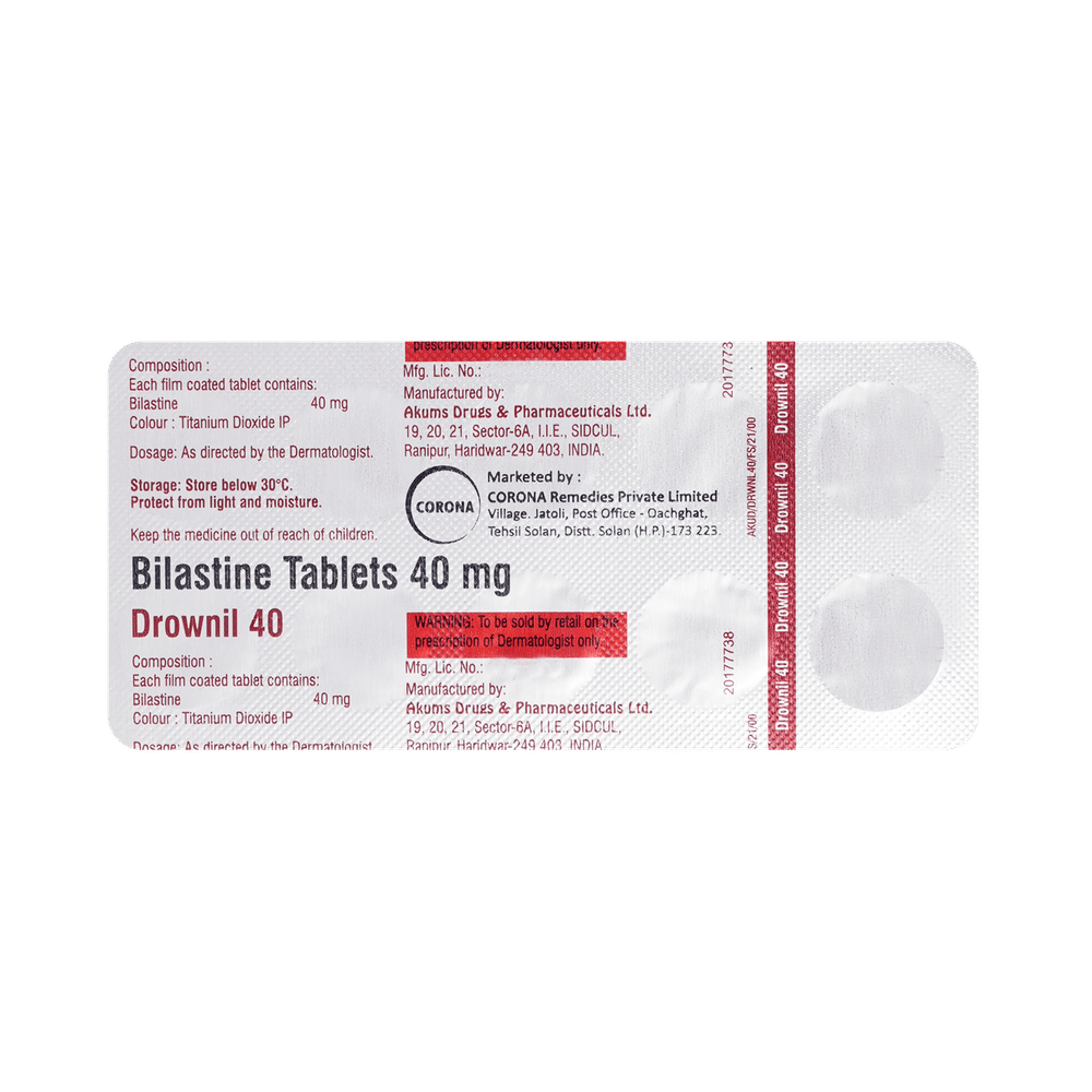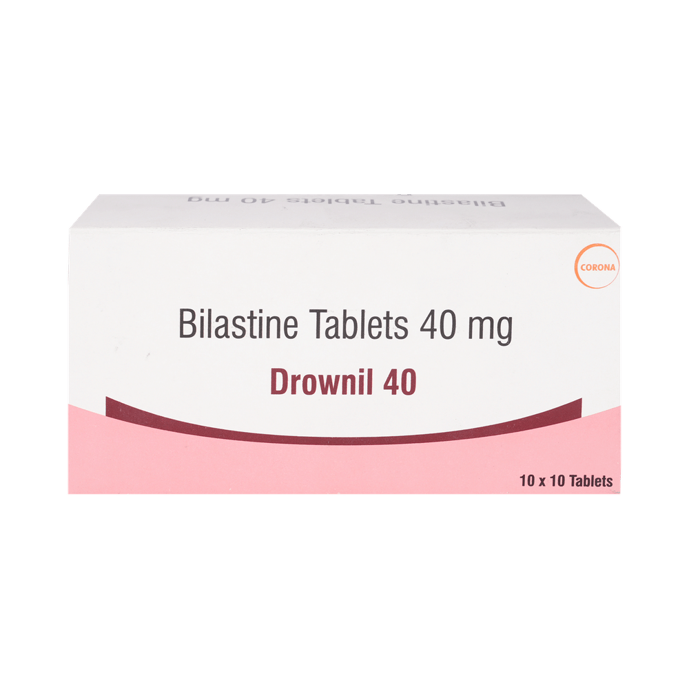 Drownil 40mg Tablet belongs to a group of medicines known as antihistamines. It is used in the treatment of allergy symptoms such as runny nose, stuffy nose, sneezing, watery eyes, and congestion or stuffiness. Drownil 40mg Tablet can be taken one hour before or two hours after food, but take it at the same time to get the most benefit. It should be taken as your doctor's advice. The dose and how often you take it depend on what you are taking it for. Your doctor will decide how much you need to improve your symptoms. Remember, dosage is decided on the basis of the type of medicine (tablet or syrup ), age, and present medical condition of the person. You should take this medicine for as long as it is prescribed for you. If you do not observe any improvement in the symptoms, consult with the doctor.The most common side effects of this medicine include headaches and drowsiness. If these bother you or appear serious, let your doctor know. There may be ways of reducing or preventing them. Generally, it is advised to drink plenty of fluids while on treatment with this medicine. To overcome dizziness, avoid driving or attention-seeking activities until you know how the medicine affects you.Before taking this medicine, let your doctor know if you are pregnant or breastfeeding. Your doctor should also know about all other medicines you are taking as many of these may make this medicine less effective or change the way it works. You must avoid fruit juice before taking the medicine.