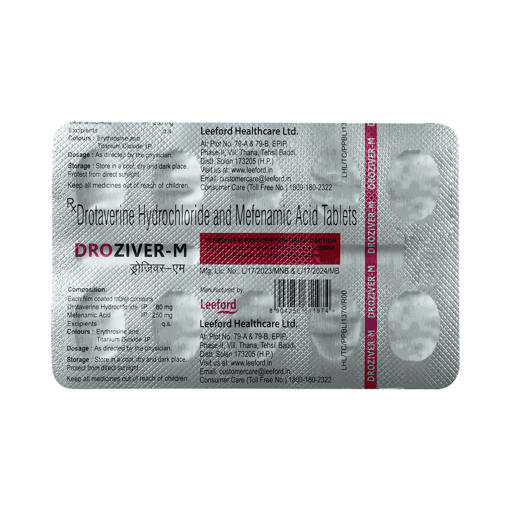 Droziver-M Tablet is a combination of two medicines: Drotaverine and Mefenamic Acid, which relieves abdominal pain and cramps. Drotaverine is an anti-spasmodic medicine which relieves contractions (spasms) associated with smooth muscles in the abdomen. Mefenamic Acid is a non-steroidal anti-inflammatory drug (NSAID). It works by blocking the release of certain chemical messengers that cause abdominal pain and inflammation (swelling).