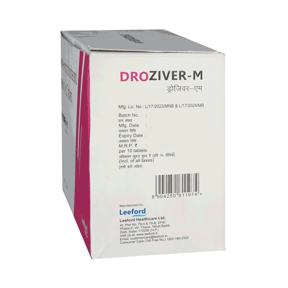 Droziver-M Tablet is a combination medicine used in the treatment of abdominal pain. It works effectively to reduce abdominal pain, bloating, discomfort and cramps by relaxing the muscles of the stomach and gut. It also blocks certain chemical messengers that cause pain and discomfort. Droziver-M Tablet is taken with food in a dose and duration as advised by the doctor. The dose you are given will depend on your condition and how you respond to the medicine. You should keep taking this medicine for as long as your doctor recommends. If you stop treatment too early your symptoms may come back and your condition may worsen. Let your healthcare team know about all other medications you are taking as some may affect, or be affected by this medicine.The most common side effects are diarrhea, nausea, vomiting, stomach pain, dryness in mouth, loss of appetite, feeling thirsty, and heartburn. Most of these are temporary and usually resolve with time. Contact your doctor straight away if you are at all concerned about any of these side effects. It may also cause dizziness and drowsiness, so do not drive or do anything that requires mental focus until you know how this medicine affects you. Avoid drinking alcohol while taking this medicine as it can worsen your dizziness.Before taking this medicine, you should tell your doctor if you are pregnant, planning pregnancy or breastfeeding. You should also tell your doctor if you have any kidney or liver diseases so that your doctor can prescribe a suitable dose for you.