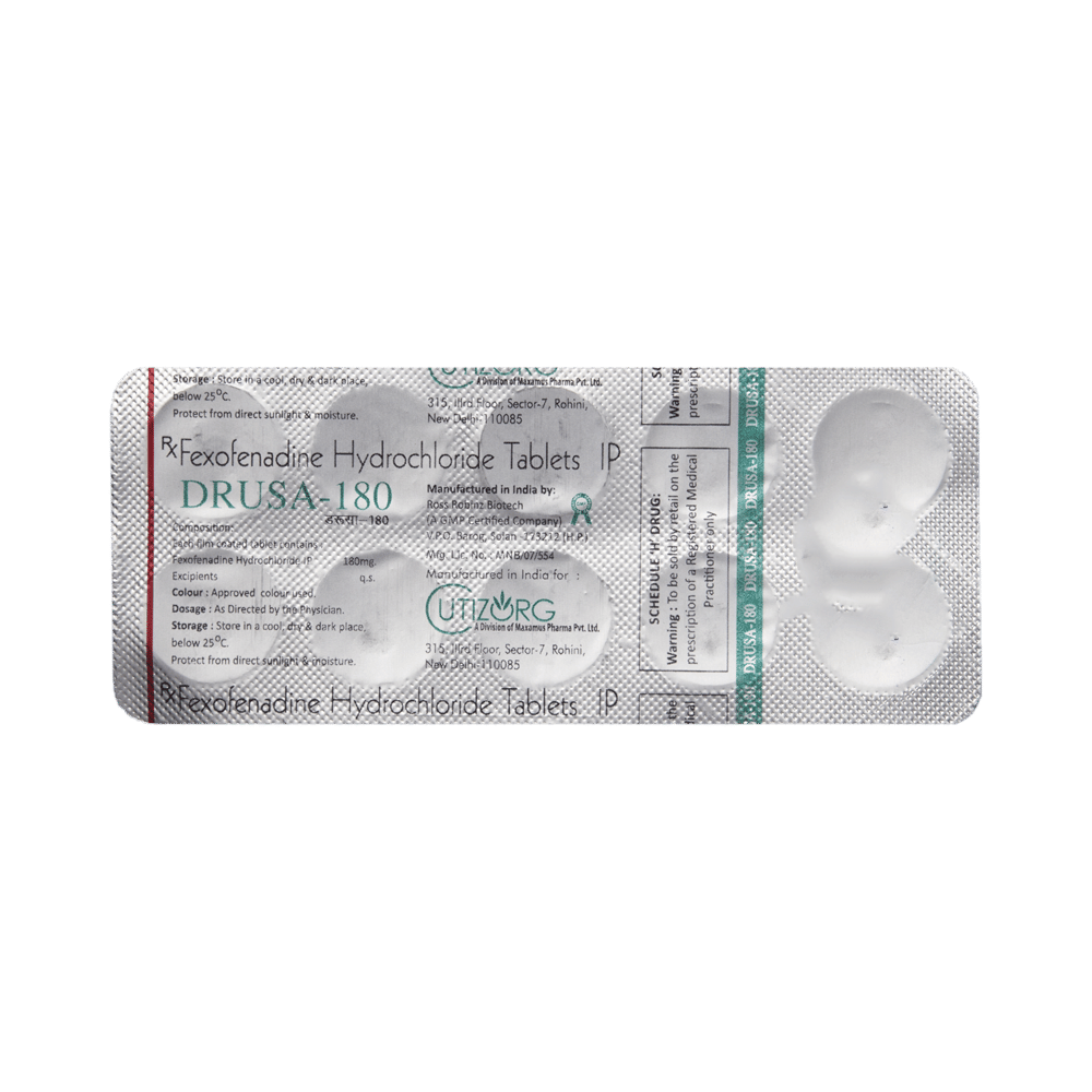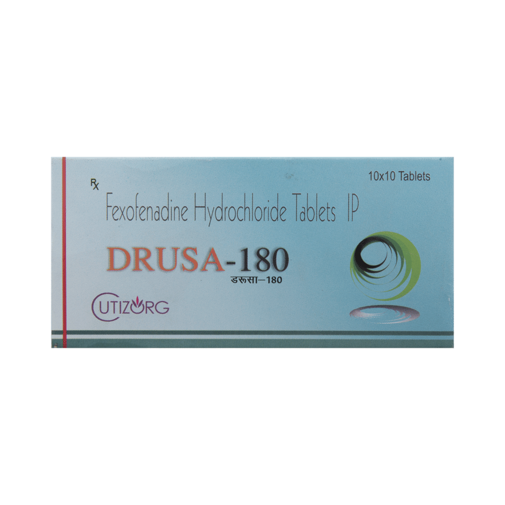 Drusa 180 Tablet is an anti-allergy medicine used in the treatment of allergic symptoms such as runny nose, congestion or stuffiness, sneezing, itching, swelling, and watery eyes. It also helps treat skin allergies with itching, redness, or swelling. Drusa 180 Tablet may be taken with or without food, in the dose and duration as advised by the doctor. The dose you are given will depend on your condition and how you respond to the medicine. You should keep taking this medicine for as long as your doctor recommends. Do not stop taking it without consulting your doctor.The most common side effects are headache, drowsiness, dizziness, and nausea. Most of these are temporary and usually resolve with time. Please consult your doctor if any of these side effects do not resolve or persist for a longer duration.Do not self-medicate or recommend your medicine to another person even if you see the similarity in symptoms. Consult your doctor to get the most benefit. Inform your doctor if you are suffering from any problems related to the kidneys, liver, or heart. Pregnant and breastfeeding mothers should not take this medicine without consulting a doctor.