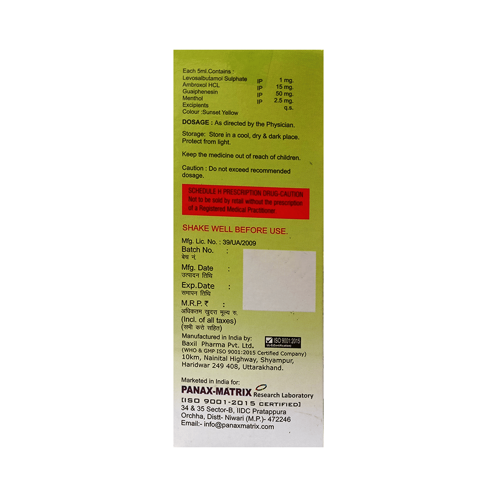 Salt Composition: Levosalbutamol (1mg) + Ambroxol (15mg) + Guaifenesin (50mg) + Menthol (2.5mg)