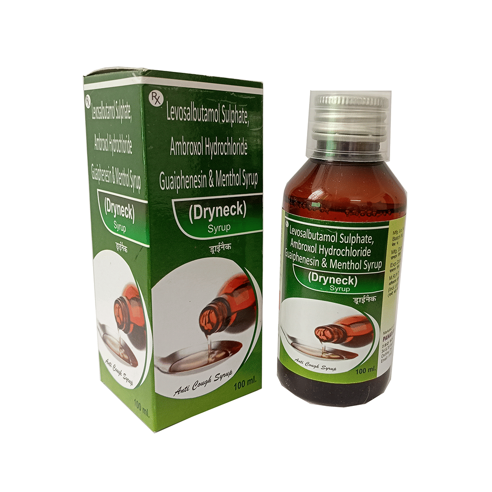 Dryneck Syrup is a combination of four medicines. Levosalbutamol is a bronchodilator. It works by relaxing the muscles in the airways and widens airways. This makes breathing easier. Ambroxol is a mucolytic medication. It thins and loosens mucus (phlegm) in the nose, windpipe and lungs making it easier to cough out and breathing. Guaifenesin is an expectorant which decreases the stickiness of mucus (phlegm) and further helps in its removal from the airways. Menthol is an extract from peppermint that produces a sensation of coolness and relieves minor throat irritation.