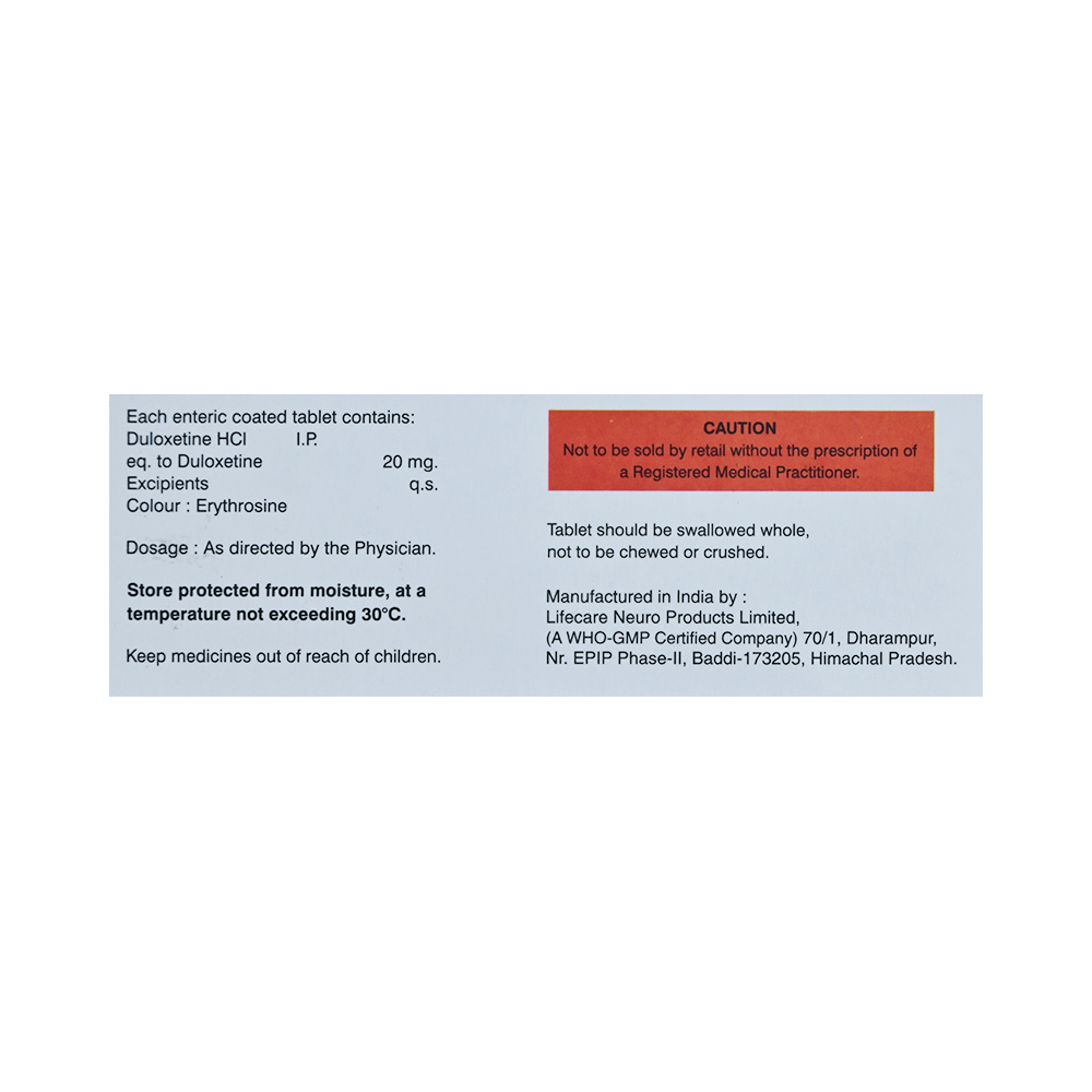 Dubant 20 Tablet works by increasing the levels of chemical messengers (serotonin and noradrenaline), natural substances in the brain that help maintain mental balance and stop the movement of pain signals in the brain.