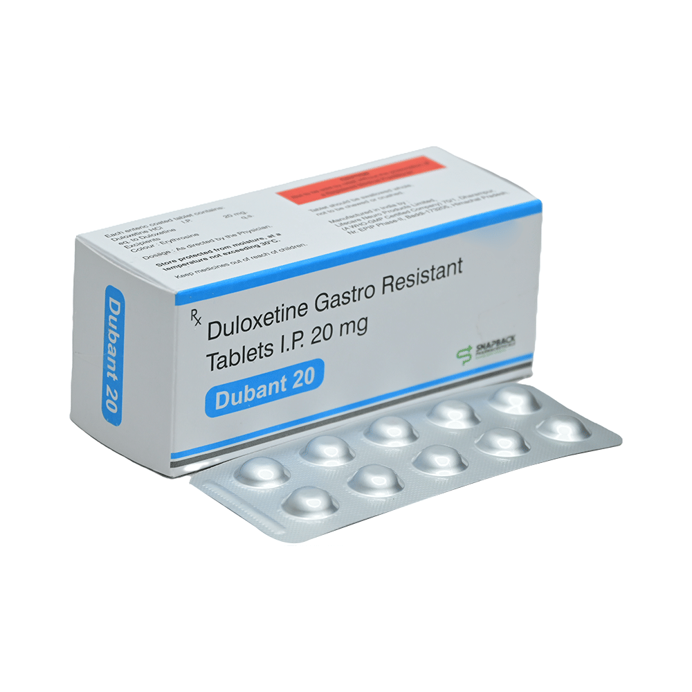 Dubant 20 Tablet is used in the treatment of depression, anxiety disorder, diabetic nerve pain, fibromyalgia (a condition in which there are generalized pain and tenderness in the body), neuropathic pain, and stress urinary incontinence. Dubant 20 Tablet works by increasing the level of chemical messengers (serotonin and noradrenaline) in the brain that have a calming effect on the brain and relax the nerves, thus treating your illness. It may be taken with or without food. It is advised to take this medicine at a fixed time each day to maintain a consistent level in the blood. If you miss any doses, take it as soon as you remember. Do not skip any doses and finish the full course of treatment even if you feel better. This medication mustn't be stopped suddenly as it may worsen your symptoms.Some common side effects of this medicine include nausea, headache, decreased libido, abnormal dreams, blurred vision, and dry mouth. It even causes dizziness and sleepiness, so do not drive or do anything that requires mental focus until you know how this medicine affects you. However, these side effects are temporary and usually resolve on their own in some time. Please consult your doctor if these do not subside or bother you.Before taking Dubant 20 Tablet, inform your doctor if you have any problems with your kidneys, heart, liver, or have a history of seizures (epilepsy or fits). Inform your doctor if you develop any unusual changes in mood or behavior, new or worsening depression, or if you have any suicidal thoughts.