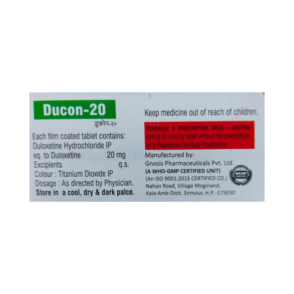 Ducon 20 Tablet is used in the treatment of depression, anxiety disorder, diabetic nerve pain, fibromyalgia (a condition in which there are generalized pain and tenderness in the body), neuropathic pain, and stress urinary incontinence. Ducon 20 Tablet works by increasing the level of chemical messengers (serotonin and noradrenaline) in the brain that have a calming effect on the brain and relax the nerves, thus treating your illness. It may be taken with or without food. It is advised to take this medicine at a fixed time each day to maintain a consistent level in the blood. If you miss any doses, take it as soon as you remember. Do not skip any doses and finish the full course of treatment even if you feel better. This medication mustn't be stopped suddenly as it may worsen your symptoms.Some common side effects of this medicine include nausea, headache, decreased libido, abnormal dreams, blurred vision, and dry mouth. It even causes dizziness and sleepiness, so do not drive or do anything that requires mental focus until you know how this medicine affects you. However, these side effects are temporary and usually resolve on their own in some time. Please consult your doctor if these do not subside or bother you.Before taking Ducon 20 Tablet, inform your doctor if you have any problems with your kidneys, heart, liver, or have a history of seizures (epilepsy or fits). Inform your doctor if you develop any unusual changes in mood or behavior, new or worsening depression, or if you have any suicidal thoughts.