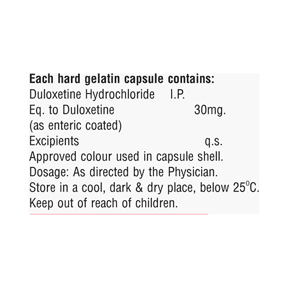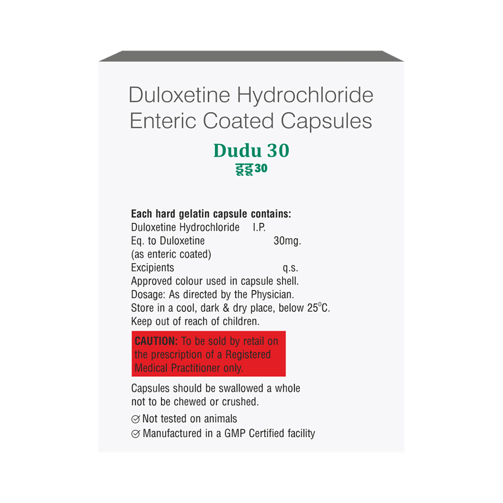 Dudu 30 Capsule is used in the treatment of depression, anxiety disorder, diabetic nerve pain, fibromyalgia (a condition in which there are generalized pain and tenderness in the body), neuropathic pain, and stress urinary incontinence. Dudu 30 Capsule works by increasing the level of chemical messengers (serotonin and noradrenaline) in the brain that have a calming effect on the brain and relax the nerves, thus treating your illness. It may be taken with or without food. It is advised to take this medicine at a fixed time each day to maintain a consistent level in the blood. If you miss any doses, take it as soon as you remember. Do not skip any doses and finish the full course of treatment even if you feel better. This medication mustn't be stopped suddenly as it may worsen your symptoms.Some common side effects of this medicine include nausea, headache, decreased libido, abnormal dreams, blurred vision, and dry mouth. It even causes dizziness and sleepiness, so do not drive or do anything that requires mental focus until you know how this medicine affects you. However, these side effects are temporary and usually resolve on their own in some time. Please consult your doctor if these do not subside or bother you.Before taking Dudu 30 Capsule, inform your doctor if you have any problems with your kidneys, heart, liver, or have a history of seizures (epilepsy or fits). Inform your doctor if you develop any unusual changes in mood or behavior, new or worsening depression, or if you have any suicidal thoughts.