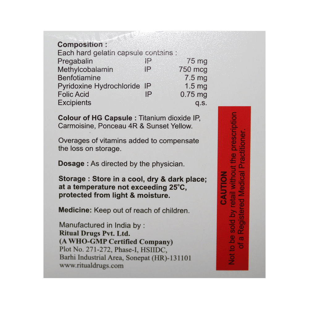 Salt Composition: Benfotiamine (7.5mg) + Folic Acid (0.75mg) + Methylcobalamin (750mcg) + Pregabalin (75mg) + Vitamin B6 (Pyridoxine) (1.5mg)