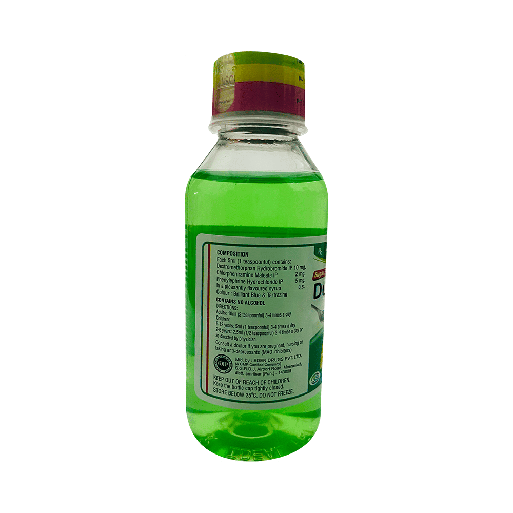 Dukof DC Cough Syrup Sugar Free is a medicine used in the treatment of common cold and cough. It can provide quick relief from cough and common cold symptoms like runny nose, stuffy nose, sneezing, watery eyes, and congestion or stuffiness. Dukof DC Cough Syrup Sugar Free is taken with or without food in a dose and duration as advised by the doctor. The dose you are given will depend on your condition and how you respond to the medicine. You should keep taking this medicine for as long as your doctor recommends. If you stop treatment too early your symptoms may come back and your condition may worsen. Let your healthcare team know about all other medications you are taking as some may affect, or be affected by this medicine.Common side effects of this medicine include headache, sedation, double vision, vomiting, diarrhea, dry mouth, and nausea. Most of these are temporary and usually resolve with time. Contact your doctor straight away if you are at all concerned about any of these side effects. This medicine can also cause sleepiness, so do not drive or do anything that requires mental focus until you know how this medicine affects you. Avoid drinking alcohol while taking this medicine as it can worsen your sleepiness.Never support self-medication or recommend your medicine to another person. It is beneficial to have plenty of fluids while taking this medication. Before taking this medicine, you should tell your doctor if you are pregnant, planning pregnancy or breastfeeding. You should also tell your doctor if you have any kidney or liver diseases so that your doctor can prescribe a suitable dose for you.