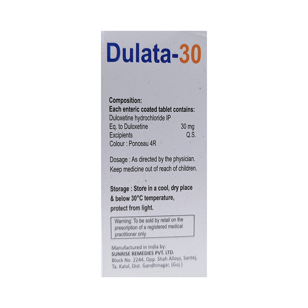 Dulata 30mg Tablet is used in the treatment of depression, anxiety disorder, diabetic nerve pain, fibromyalgia (a condition in which there are generalized pain and tenderness in the body), neuropathic pain, and stress urinary incontinence. Dulata 30mg Tablet works by increasing the level of chemical messengers (serotonin and noradrenaline) in the brain that have a calming effect on the brain and relax the nerves, thus treating your illness. It may be taken with or without food. It is advised to take this medicine at a fixed time each day to maintain a consistent level in the blood. If you miss any doses, take it as soon as you remember. Do not skip any doses and finish the full course of treatment even if you feel better. This medication mustn't be stopped suddenly as it may worsen your symptoms.Some common side effects of this medicine include nausea, headache, decreased libido, abnormal dreams, blurred vision, and dry mouth. It even causes dizziness and sleepiness, so do not drive or do anything that requires mental focus until you know how this medicine affects you. However, these side effects are temporary and usually resolve on their own in some time. Please consult your doctor if these do not subside or bother you.Before taking Dulata 30mg Tablet, inform your doctor if you have any problems with your kidneys, heart, liver, or have a history of seizures (epilepsy or fits). Inform your doctor if you develop any unusual changes in mood or behavior, new or worsening depression, or if you have any suicidal thoughts.