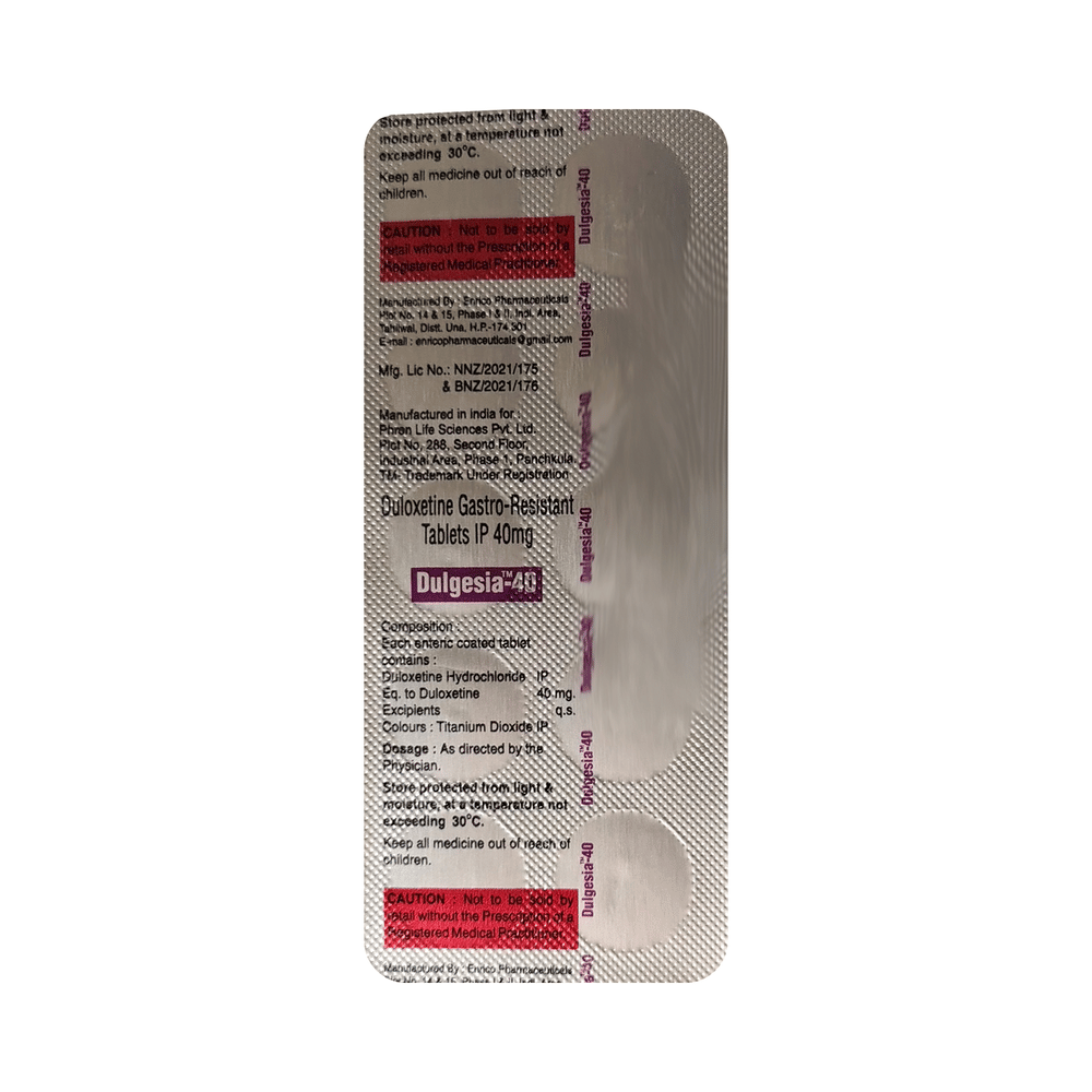 Dulgesia 40 Tablet works by increasing the levels of chemical messengers (serotonin and noradrenaline), natural substances in the brain that help maintain mental balance and stop the movement of pain signals in the brain.