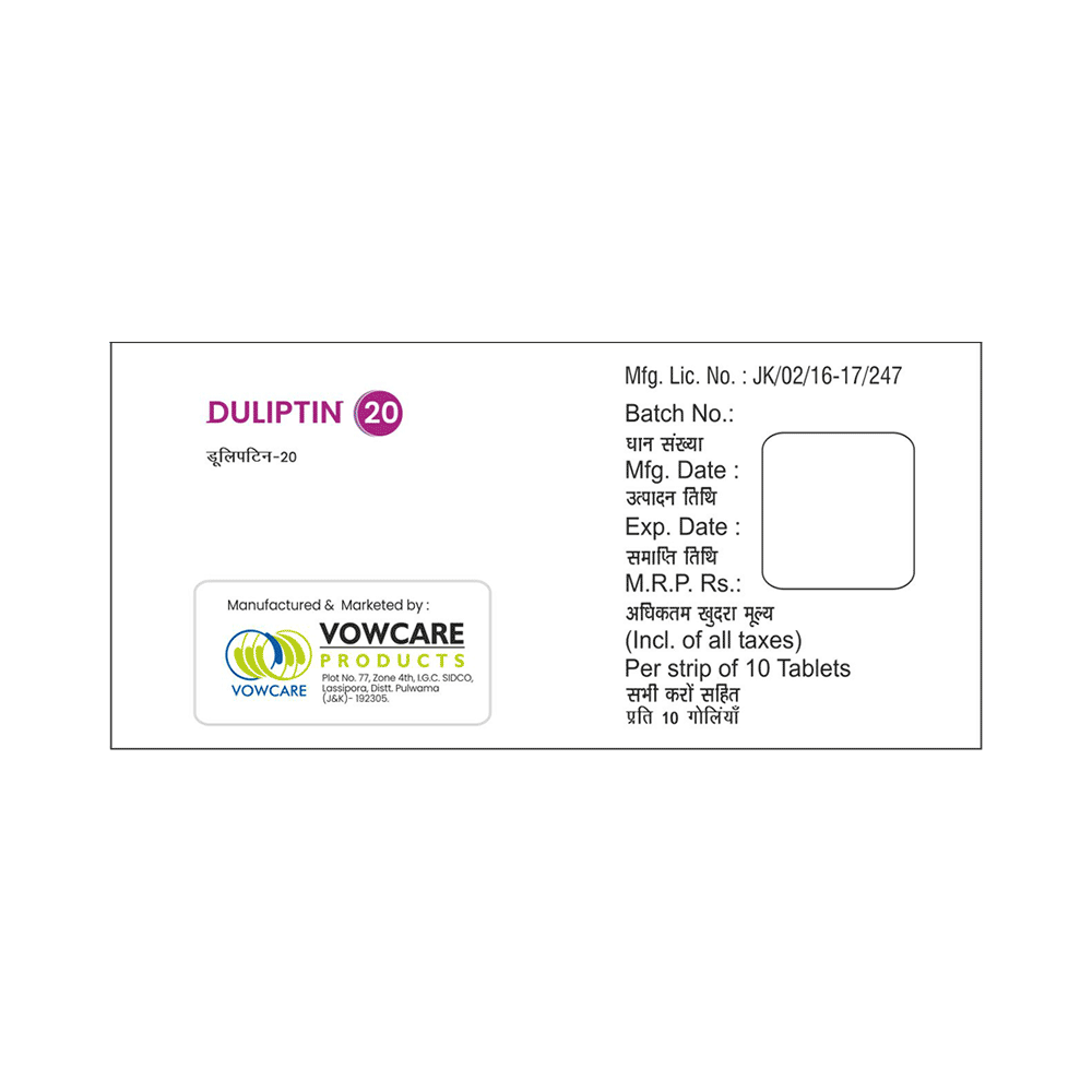 Duliptin 20 Tablet is used in the treatment of depression, anxiety disorder, diabetic nerve pain, fibromyalgia (a condition in which there are generalized pain and tenderness in the body), neuropathic pain, and stress urinary incontinence. Duliptin 20 Tablet works by increasing the level of chemical messengers (serotonin and noradrenaline) in the brain that have a calming effect on the brain and relax the nerves, thus treating your illness. It may be taken with or without food. It is advised to take this medicine at a fixed time each day to maintain a consistent level in the blood. If you miss any doses, take it as soon as you remember. Do not skip any doses and finish the full course of treatment even if you feel better. This medication mustn't be stopped suddenly as it may worsen your symptoms.Some common side effects of this medicine include nausea, headache, decreased libido, abnormal dreams, blurred vision, and dry mouth. It even causes dizziness and sleepiness, so do not drive or do anything that requires mental focus until you know how this medicine affects you. However, these side effects are temporary and usually resolve on their own in some time. Please consult your doctor if these do not subside or bother you.Before taking Duliptin 20 Tablet, inform your doctor if you have any problems with your kidneys, heart, liver, or have a history of seizures (epilepsy or fits). Inform your doctor if you develop any unusual changes in mood or behavior, new or worsening depression, or if you have any suicidal thoughts.