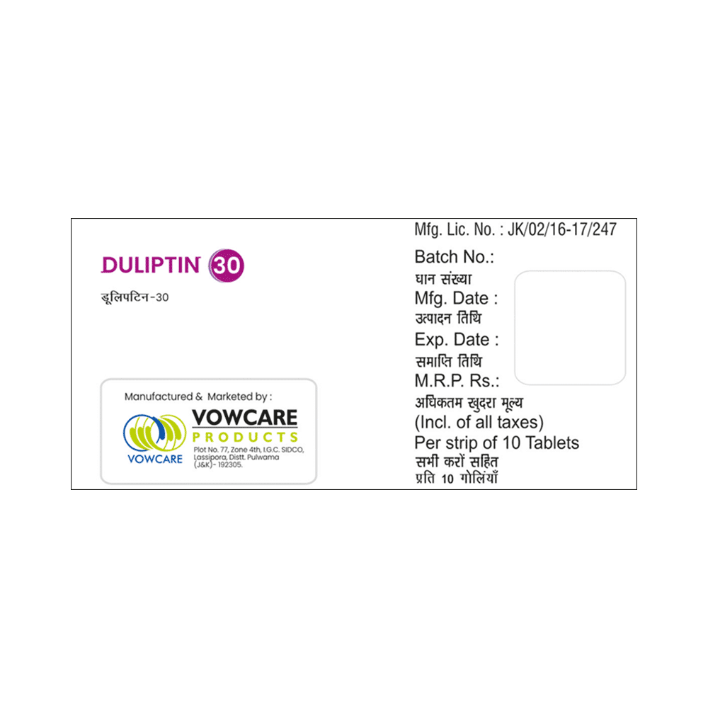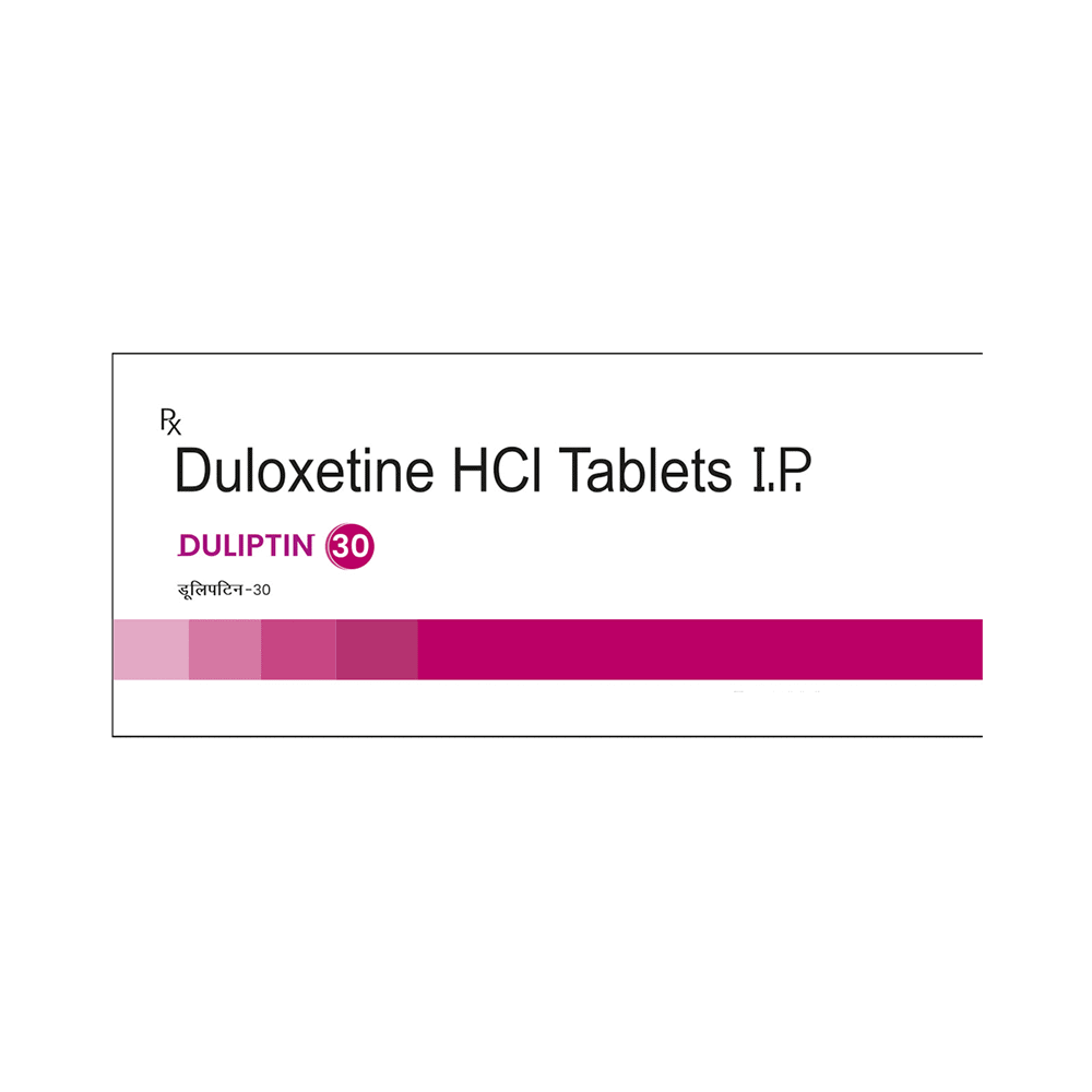 Duliptin 30 Tablet is used in the treatment of depression, anxiety disorder, diabetic nerve pain, fibromyalgia (a condition in which there are generalized pain and tenderness in the body), neuropathic pain, and stress urinary incontinence. Duliptin 30 Tablet works by increasing the level of chemical messengers (serotonin and noradrenaline) in the brain that have a calming effect on the brain and relax the nerves, thus treating your illness. It may be taken with or without food. It is advised to take this medicine at a fixed time each day to maintain a consistent level in the blood. If you miss any doses, take it as soon as you remember. Do not skip any doses and finish the full course of treatment even if you feel better. This medication mustn't be stopped suddenly as it may worsen your symptoms.Some common side effects of this medicine include nausea, headache, decreased libido, abnormal dreams, blurred vision, and dry mouth. It even causes dizziness and sleepiness, so do not drive or do anything that requires mental focus until you know how this medicine affects you. However, these side effects are temporary and usually resolve on their own in some time. Please consult your doctor if these do not subside or bother you.Before taking Duliptin 30 Tablet, inform your doctor if you have any problems with your kidneys, heart, liver, or have a history of seizures (epilepsy or fits). Inform your doctor if you develop any unusual changes in mood or behavior, new or worsening depression, or if you have any suicidal thoughts.