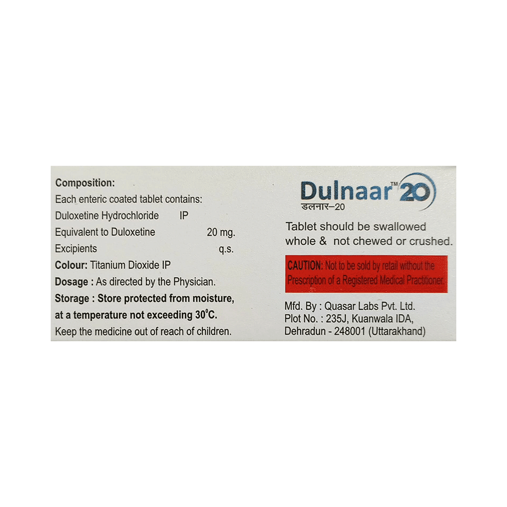 Dulnaar 20 Tablet works by increasing the levels of chemical messengers (serotonin and noradrenaline), natural substances in the brain that help maintain mental balance and stop the movement of pain signals in the brain.