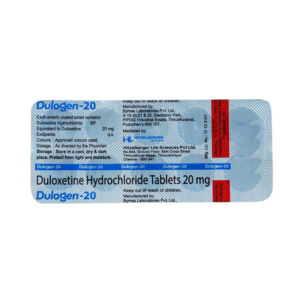 Dulogen 20 Tablet is used in the treatment of depression, anxiety disorder, diabetic nerve pain, fibromyalgia (a condition in which there are generalized pain and tenderness in the body), neuropathic pain, and stress urinary incontinence. Dulogen 20 Tablet works by increasing the level of chemical messengers (serotonin and noradrenaline) in the brain that have a calming effect on the brain and relax the nerves, thus treating your illness. It may be taken with or without food. It is advised to take this medicine at a fixed time each day to maintain a consistent level in the blood. If you miss any doses, take it as soon as you remember. Do not skip any doses and finish the full course of treatment even if you feel better. This medication mustn't be stopped suddenly as it may worsen your symptoms.Some common side effects of this medicine include nausea, headache, decreased libido, abnormal dreams, blurred vision, and dry mouth. It even causes dizziness and sleepiness, so do not drive or do anything that requires mental focus until you know how this medicine affects you. However, these side effects are temporary and usually resolve on their own in some time. Please consult your doctor if these do not subside or bother you.Before taking Dulogen 20 Tablet, inform your doctor if you have any problems with your kidneys, heart, liver, or have a history of seizures (epilepsy or fits). Inform your doctor if you develop any unusual changes in mood or behavior, new or worsening depression, or if you have any suicidal thoughts.