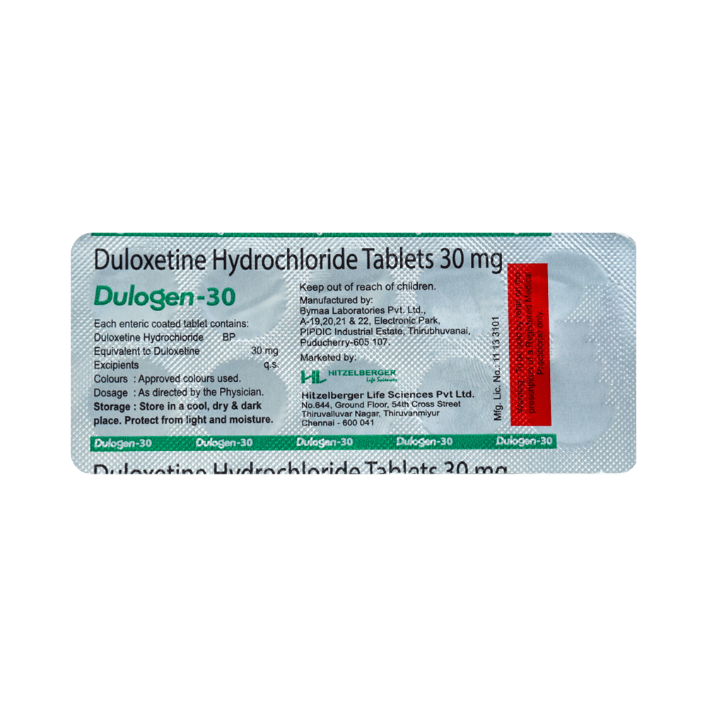 Dulogen 30 Tablet is used in the treatment of depression, anxiety disorder, diabetic nerve pain, fibromyalgia (a condition in which there are generalized pain and tenderness in the body), neuropathic pain, and stress urinary incontinence. Dulogen 30 Tablet works by increasing the level of chemical messengers (serotonin and noradrenaline) in the brain that have a calming effect on the brain and relax the nerves, thus treating your illness. It may be taken with or without food. It is advised to take this medicine at a fixed time each day to maintain a consistent level in the blood. If you miss any doses, take it as soon as you remember. Do not skip any doses and finish the full course of treatment even if you feel better. This medication mustn't be stopped suddenly as it may worsen your symptoms.Some common side effects of this medicine include nausea, headache, decreased libido, abnormal dreams, blurred vision, and dry mouth. It even causes dizziness and sleepiness, so do not drive or do anything that requires mental focus until you know how this medicine affects you. However, these side effects are temporary and usually resolve on their own in some time. Please consult your doctor if these do not subside or bother you.Before taking Dulogen 30 Tablet, inform your doctor if you have any problems with your kidneys, heart, liver, or have a history of seizures (epilepsy or fits). Inform your doctor if you develop any unusual changes in mood or behavior, new or worsening depression, or if you have any suicidal thoughts.