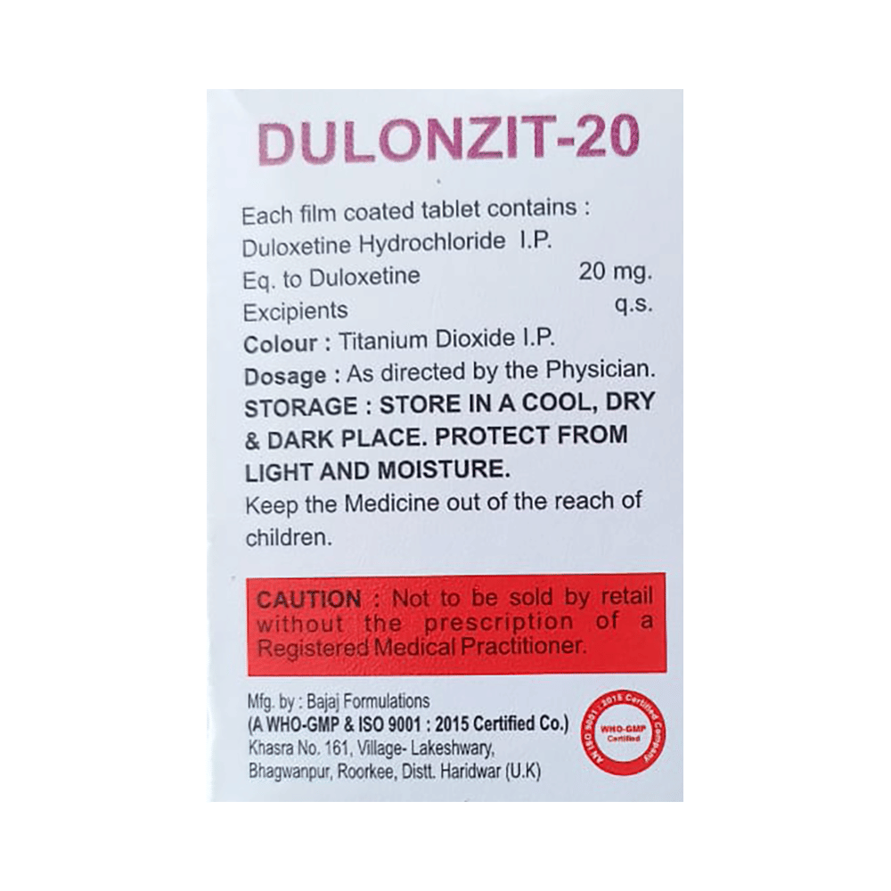 Dulonzit 20 Tablet works by increasing the levels of chemical messengers (serotonin and noradrenaline), natural substances in the brain that help maintain mental balance and stop the movement of pain signals in the brain.