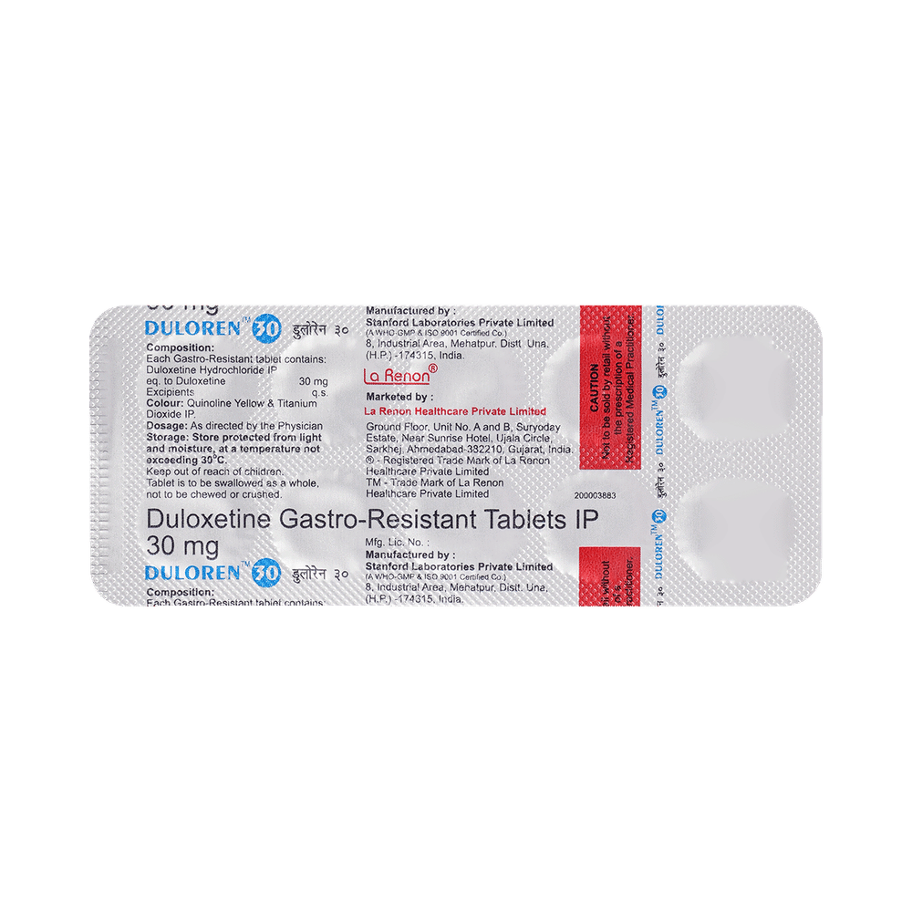 Duloren 30mg Tablet is used in the treatment of depression, anxiety disorder, diabetic nerve pain, fibromyalgia (a condition in which there are generalized pain and tenderness in the body), neuropathic pain, and stress urinary incontinence. Duloren 30mg Tablet works by increasing the level of chemical messengers (serotonin and noradrenaline) in the brain that have a calming effect on the brain and relax the nerves, thus treating your illness. It may be taken with or without food. It is advised to take this medicine at a fixed time each day to maintain a consistent level in the blood. If you miss any doses, take it as soon as you remember. Do not skip any doses and finish the full course of treatment even if you feel better. This medication mustn't be stopped suddenly as it may worsen your symptoms.Some common side effects of this medicine include nausea, headache, decreased libido, abnormal dreams, blurred vision, and dry mouth. It even causes dizziness and sleepiness, so do not drive or do anything that requires mental focus until you know how this medicine affects you. However, these side effects are temporary and usually resolve on their own in some time. Please consult your doctor if these do not subside or bother you.Before taking Duloren 30mg Tablet, inform your doctor if you have any problems with your kidneys, heart, liver, or have a history of seizures (epilepsy or fits). Inform your doctor if you develop any unusual changes in mood or behavior, new or worsening depression, or if you have any suicidal thoughts.