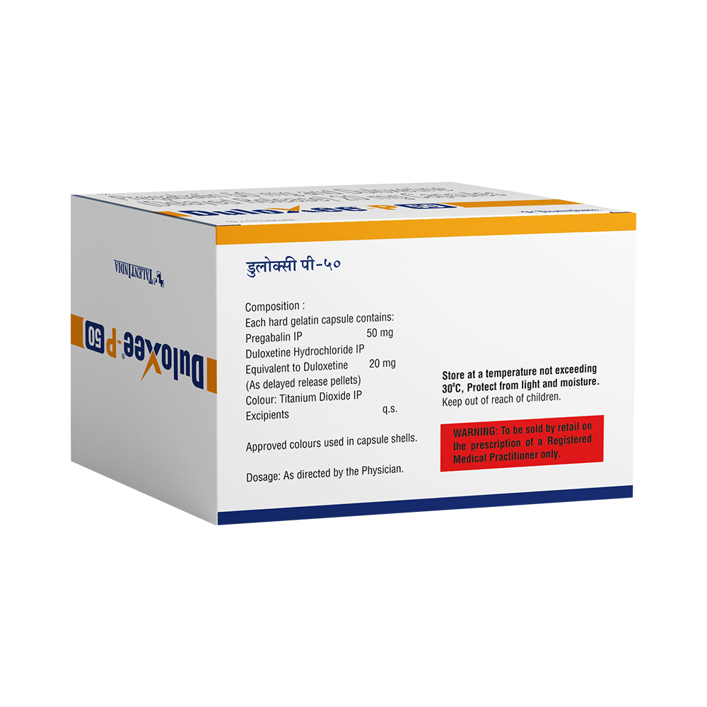 Duloxee-P 50 Capsule DR is used for the treatment of neuropathic pain. It decreases pain by controlling calcium channel activity of the nerve cells. It also increases the level of chemical messengers in the brain that helps maintain mental balance and stop the movement of pain signals in the brain. Duloxee-P 50 Capsule DR can be taken with or without food. However, it is advised to take it at the same time each day as this helps to maintain a consistent level of medicine in the body. Take this medicine in the dose and duration advised by your doctor as this is habit forming medicine. If you miss a dose of this medicine, take it as soon as you remember. Finish the full course of the treatment even if you feel better. It is important not to stop taking this medicine suddenly as it may worsen your symptoms.Some common side effects of this medicine include peripheral edema, nausea, headache, dryness of mouth, difficulty in concentration and blurred vision. It may cause dizziness and sleepiness, so do not drive or do anything that requires mental focus until you know how this medicine affects you. This medicine may cause weight gain and to control it, you should have a balanced diet and exercise regularly. It is important to inform your doctor if you develop any unusual changes in mood or behavior, new or worsening depression, or suicidal thoughts.Before taking this medicine let your doctor know if you suffer from kidney or liver disease. Your doctor should also know about all other medicines you are taking as many of these may make this medicine less effective or change the way it works. Inform your doctor if you are pregnant, planning pregnancy or breastfeeding.
