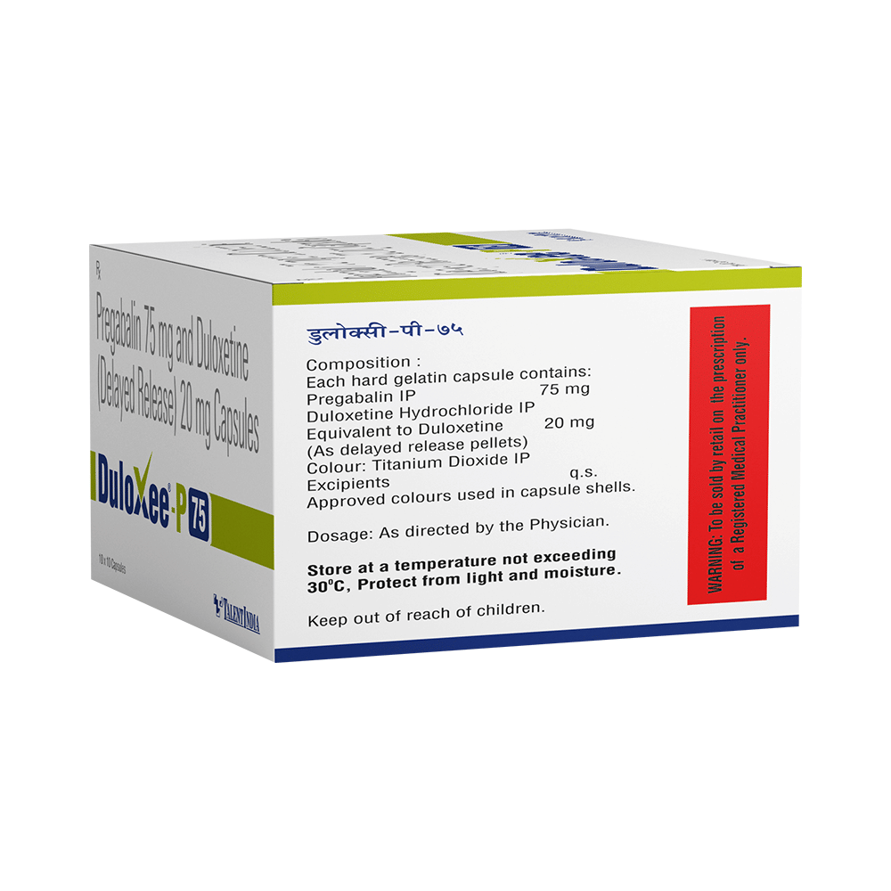 Duloxee-P 75 Capsule DR is used for the treatment of neuropathic pain. It decreases pain by controlling calcium channel activity of the nerve cells. It also increases the level of chemical messengers in the brain that helps maintain mental balance and stop the movement of pain signals in the brain. Duloxee-P 75 Capsule DR can be taken with or without food. However, it is advised to take it at the same time each day as this helps to maintain a consistent level of medicine in the body. Take this medicine in the dose and duration advised by your doctor as this is habit forming medicine. If you miss a dose of this medicine, take it as soon as you remember. Finish the full course of the treatment even if you feel better. It is important not to stop taking this medicine suddenly as it may worsen your symptoms.Some common side effects of this medicine include peripheral edema, nausea, headache, dryness of mouth, difficulty in concentration and blurred vision. It may cause dizziness and sleepiness, so do not drive or do anything that requires mental focus until you know how this medicine affects you. This medicine may cause weight gain and to control it, you should have a balanced diet and exercise regularly. It is important to inform your doctor if you develop any unusual changes in mood or behavior, new or worsening depression, or suicidal thoughts.Before taking this medicine let your doctor know if you suffer from kidney or liver disease. Your doctor should also know about all other medicines you are taking as many of these may make this medicine less effective or change the way it works. Inform your doctor if you are pregnant, planning pregnancy or breastfeeding.