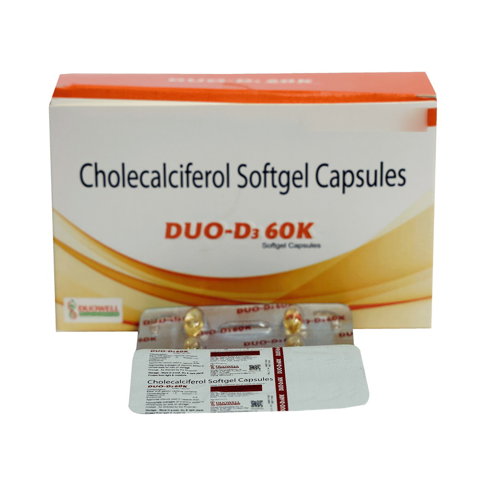 Duo-D3 60 K Softgel Capsule is a form of vitamin D. It raises vitamin D levels in your blood. This, in turn, increases calcium levels in your blood by helping you absorb more calcium from food.