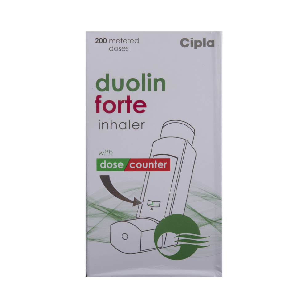 DUOlin Forte Inhaler is used for the treatment of chronic obstructive pulmonary disorder (a lung disorder in which the flow of air to the lungs is blocked). It helps in relaxing the muscles of the air passages and making it easier to breathe. It relieves coughing, wheezing and feeling short of breath. Your doctor will tell you how often you need to use your inhaler. The effect of this medicine may be noticeable after a few days but will only reach its maximum after a few weeks. This medicine must be used regularly to be effective, so go on taking it even if you don't have any symptoms. That means it’s doing its job. If you stop taking it your COPD may get worse. This medicine should not be used to relieve sudden shortness of breath. If sudden shortness of breath occurs, use your rescue inhaler. To get the benefit from this medicine you need to make sure you get your inhaler technique right, otherwise, it Does not work as well.The most common side effects are dryness in mouth, shortness of breath, cough, tremor, headache, palpitations, and muscle cramp. If you get there, don’t stop taking it but do talk to your doctor. You can prevent some of these symptoms by rinsing your mouth and throat with water or brushing your teeth after using your inhaler. There are other, rarer side effects which can be serious. Talk to your doctor if you're worried about them.Before taking it, you should tell your doctor if you have any kidney or liver diseases so that your doctor can prescribe a suitable dose for you. Also tell your doctor if you are pregnant, planning pregnancy or breastfeeding.